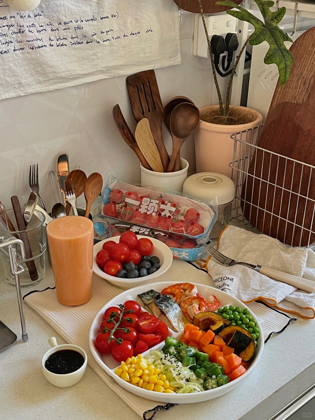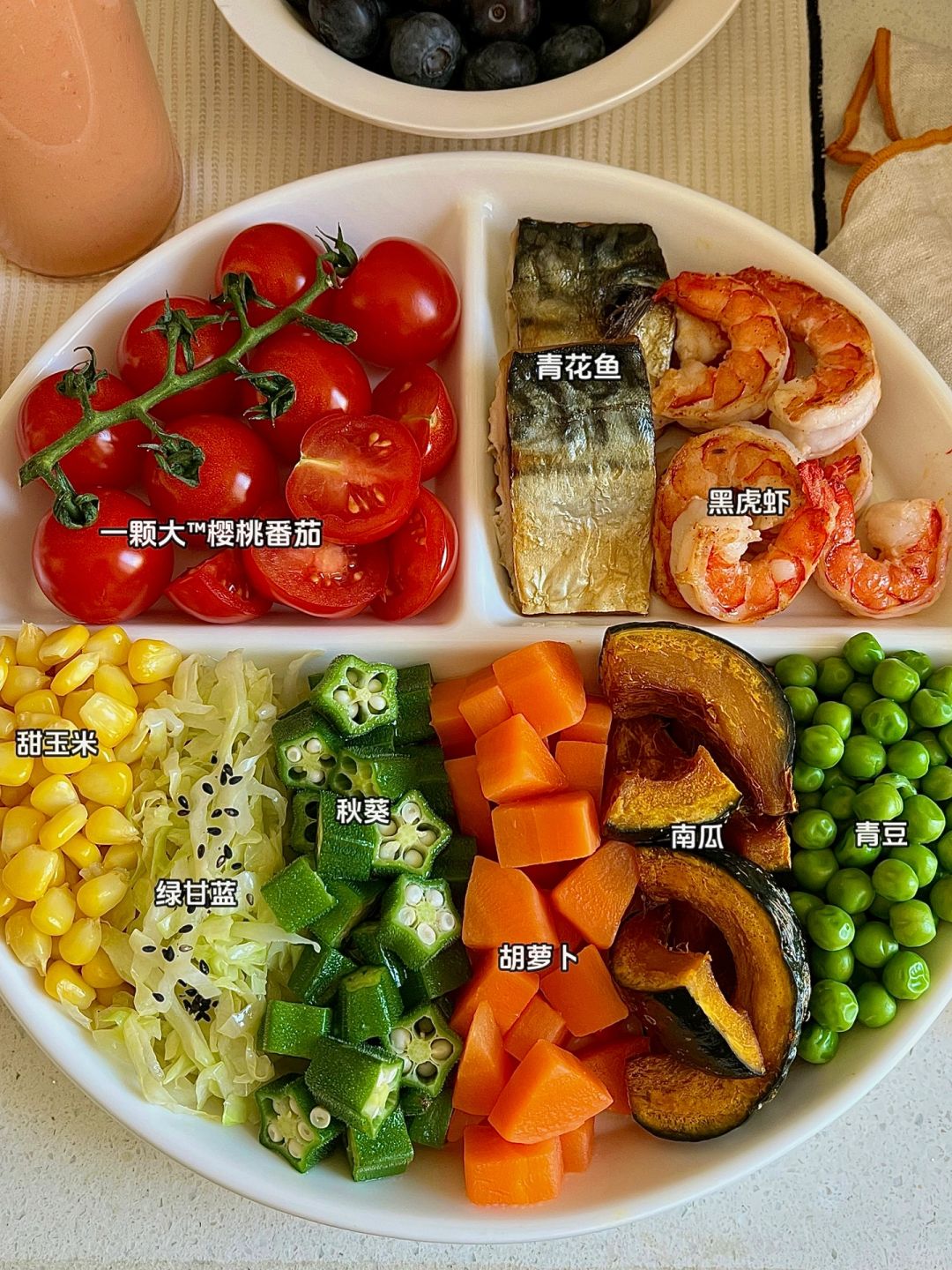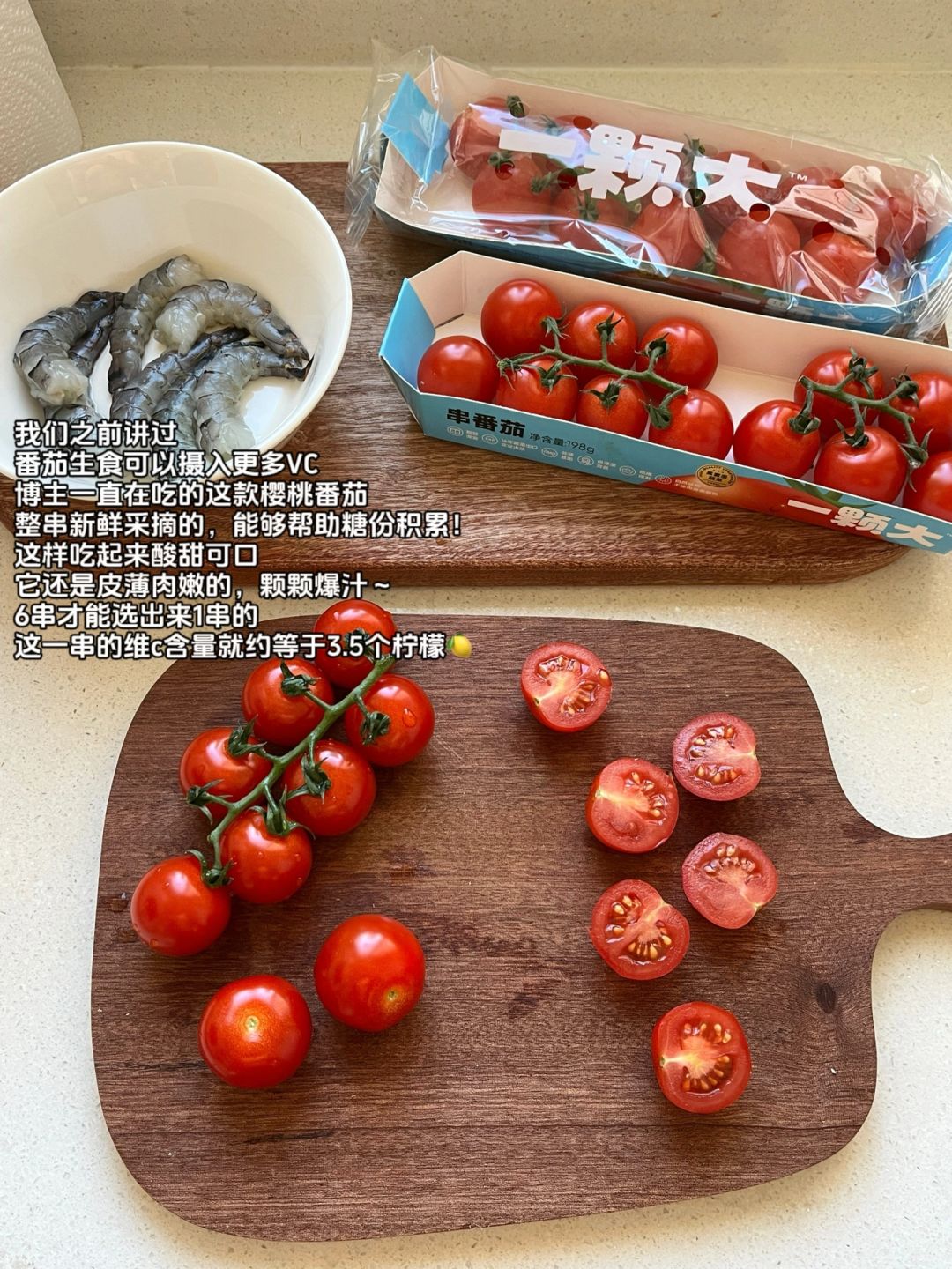 🏷今天午餐食物合集 🍅一颗大樱桃番茄🦐黑虎虾🐟青花鱼 🎃南瓜🌽甜玉米/秋葵/绿甘蓝🥕胡萝卜 🫐蓝莓🍎苹果🍍菠萝/青豆 - 这个樱桃番茄含有维生素C/β-胡萝卜素/叶酸和钾 是一种既日常又营养的果蔬 既可以作为餐品也可以作为茶歇食用~ 博主喜欢糖份更好积累的整串番茄 新鲜又酸甜可口!颗颗爆汁太满足我的味蕾了~ 一串番茄的维C含量相当于3个半的柠檬🍋 营养又好吃😋稀饭~ - ⚠️小叮嘱 番茄生食可以摄入更多维生素C -