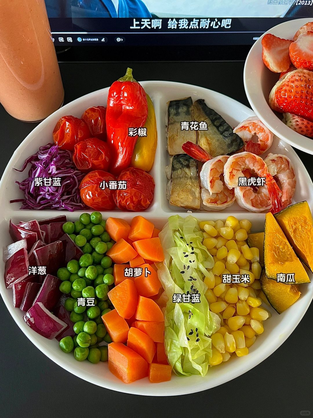 🏷今天早餐食物合集 🐟青花鱼🦐黑虎虾🫑彩椒🍅小番茄/紫甘蓝 🧅洋葱🥕胡萝卜/青豆/绿甘蓝🌽甜玉米 🎃贝贝南瓜🍎苹果🍍菠萝🍓草莓 - 早餐的碳水来源就是玉米和南瓜~ 不吃麸质(小麦/大麦/黑麦制品)和白饭 -