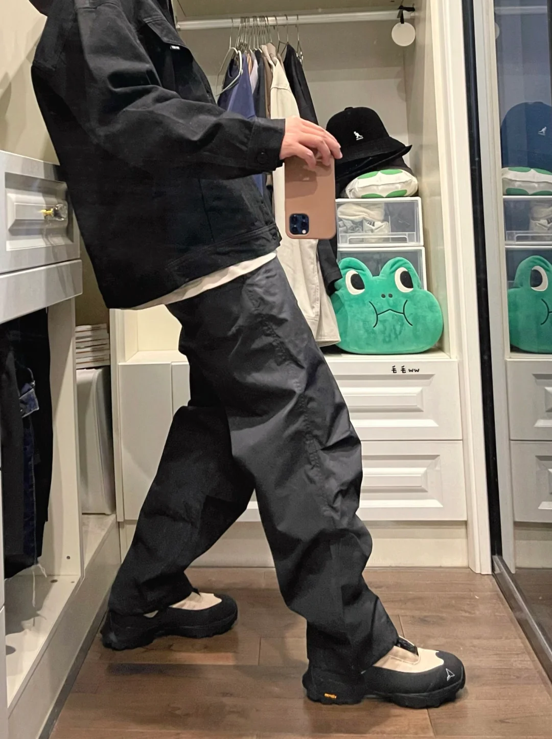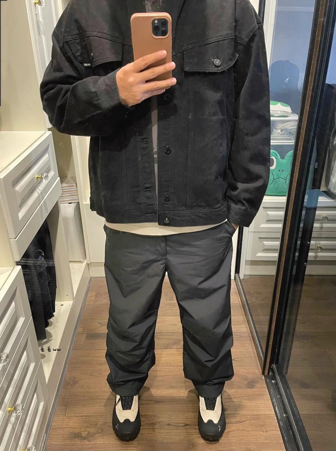 -厚实的牛仔外套,是叠穿的常用单品;内搭不用复杂,卫衣体恤打底即可 . -沉稳的黑色系搭配,适合秋冬季节;宽松的降落伞裤,内搭细节与球鞋呼应 . —————— . ✏️本人178cm75kg 球鞋尺码265mm(正常EU42) . 💭以上均为我个人观点,不喜勿喷,欢迎讨论。