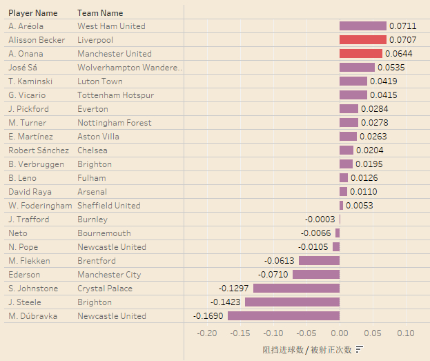 本赛季阻挡进球数最多的英超门将,即使除以被射正次数阿利松和奥纳纳的都相差不多。#