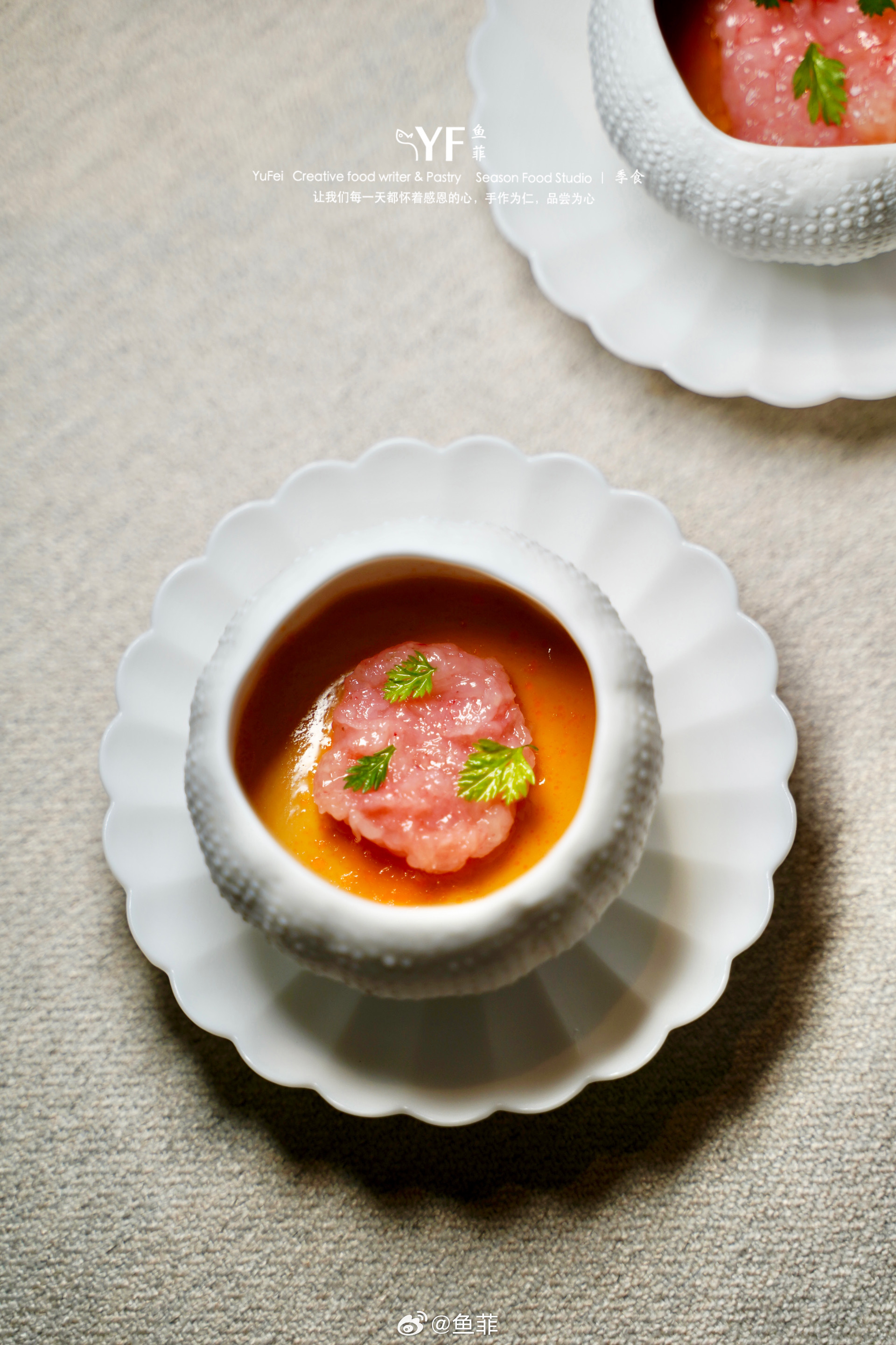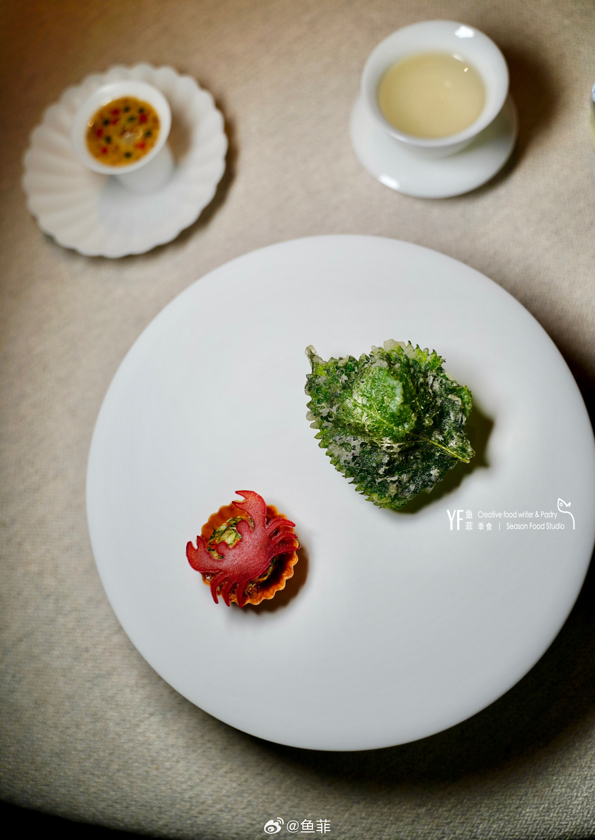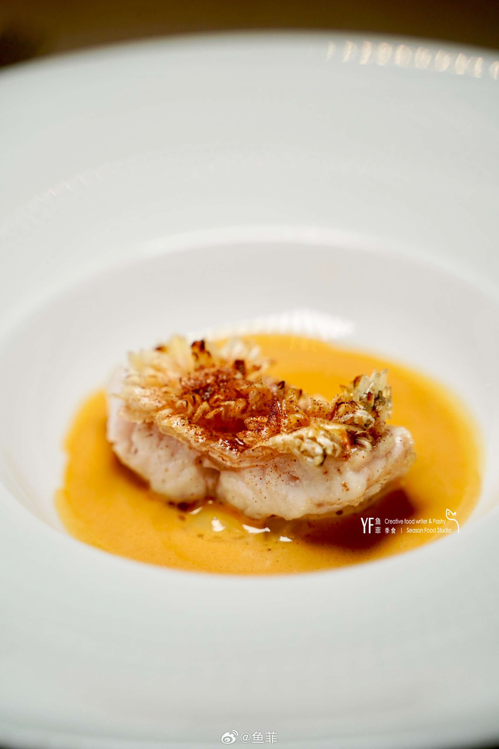 整道菜以“马赛鱼汤”的烹制方式,用舟山“石九公”(岩鱼类)熬制底汤,搭配鲜甜的北戴河扇贝肉,上面是立鳞烧做法的白甘鲷,融合日系法式的融合烹饪方式,特别推荐!👍🏻