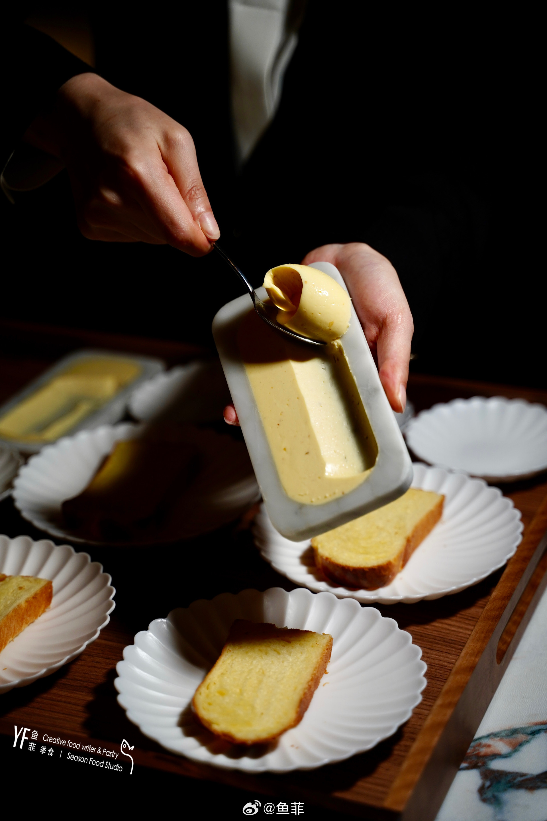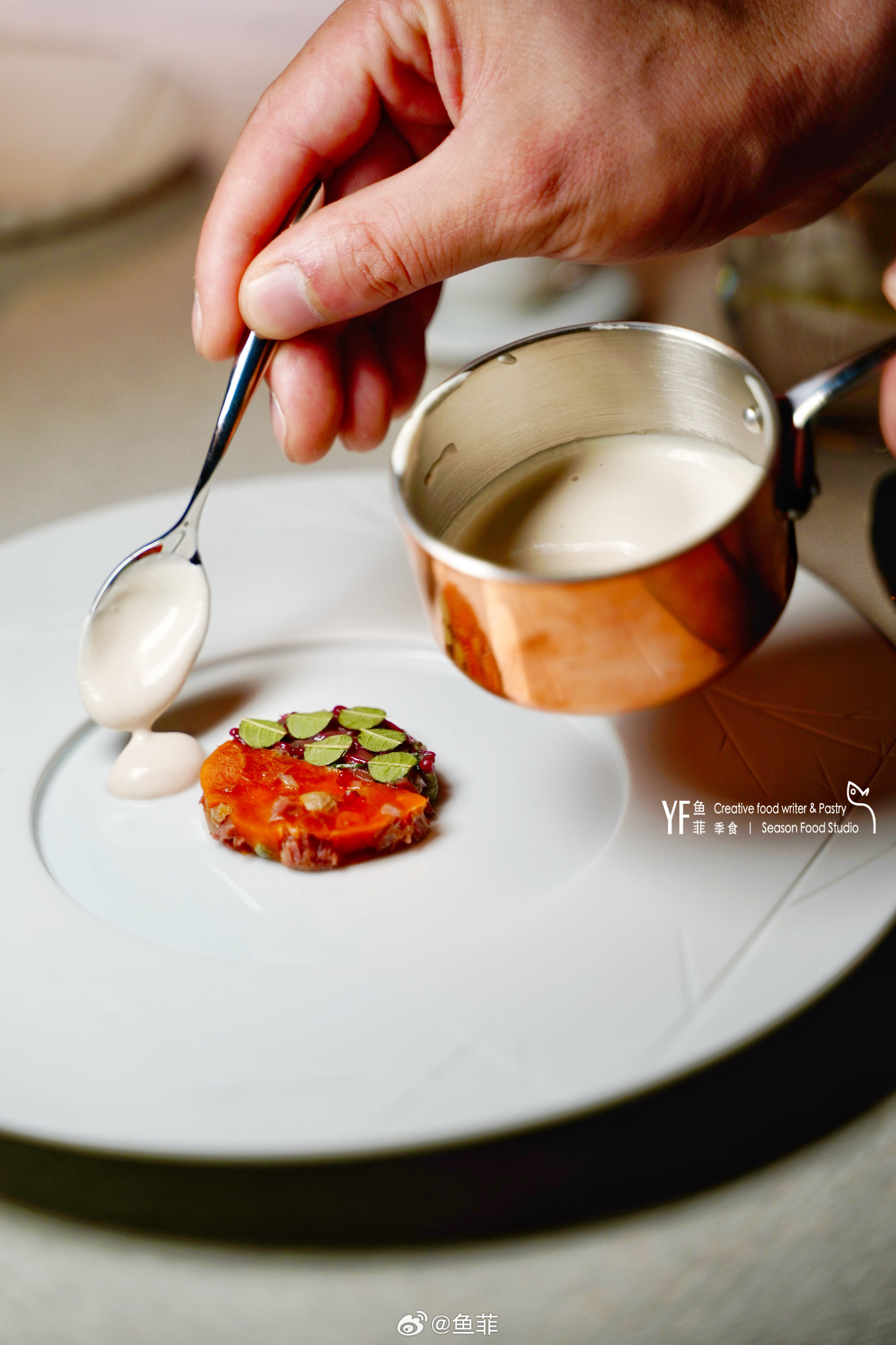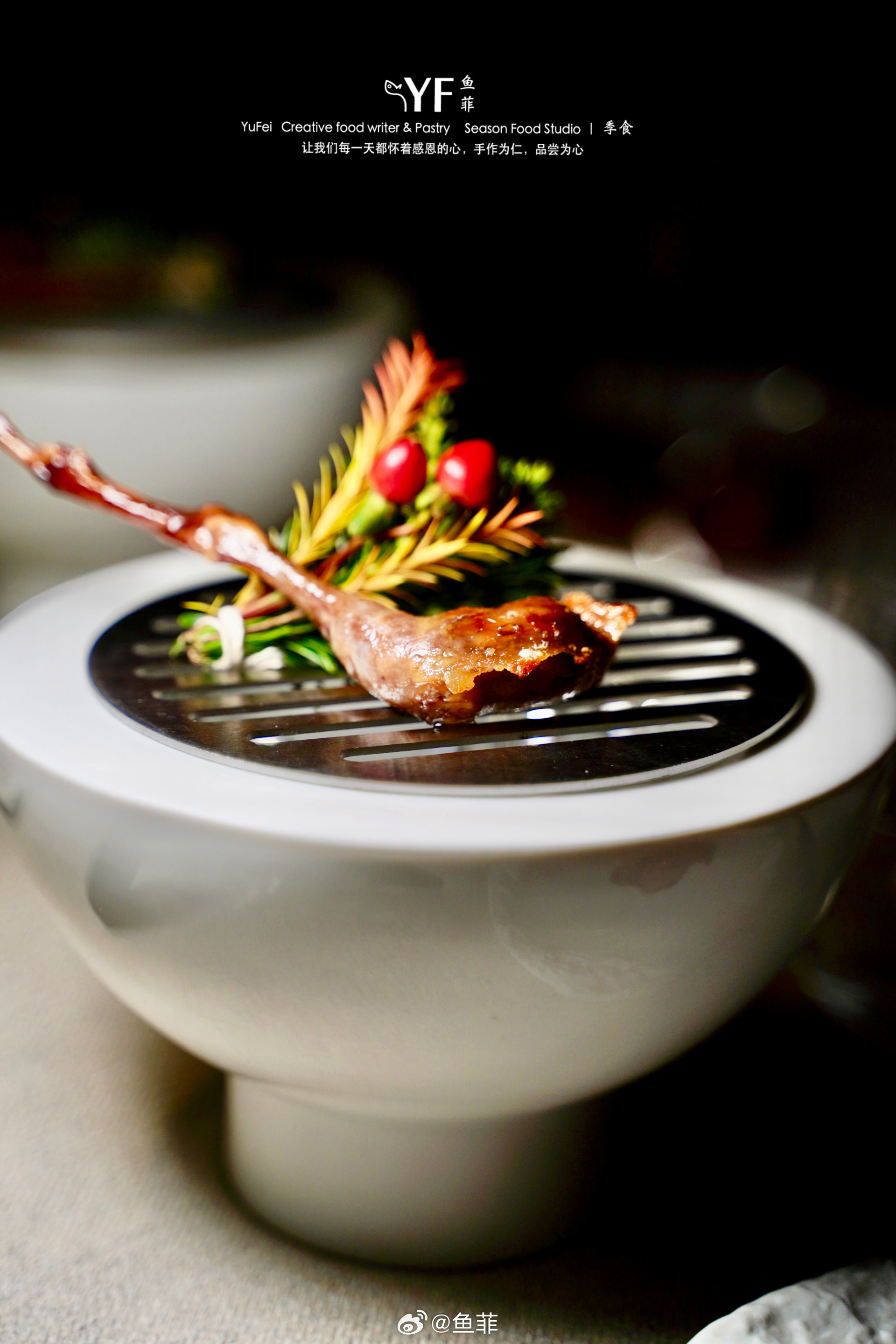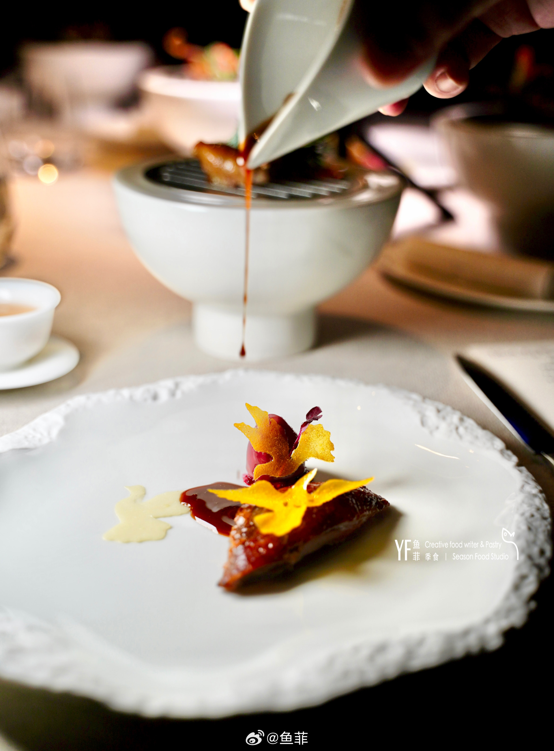 烟熏乳鸽腿呈现,我偏爱用鸽肝做的鹅肝慕斯,醇厚浓郁