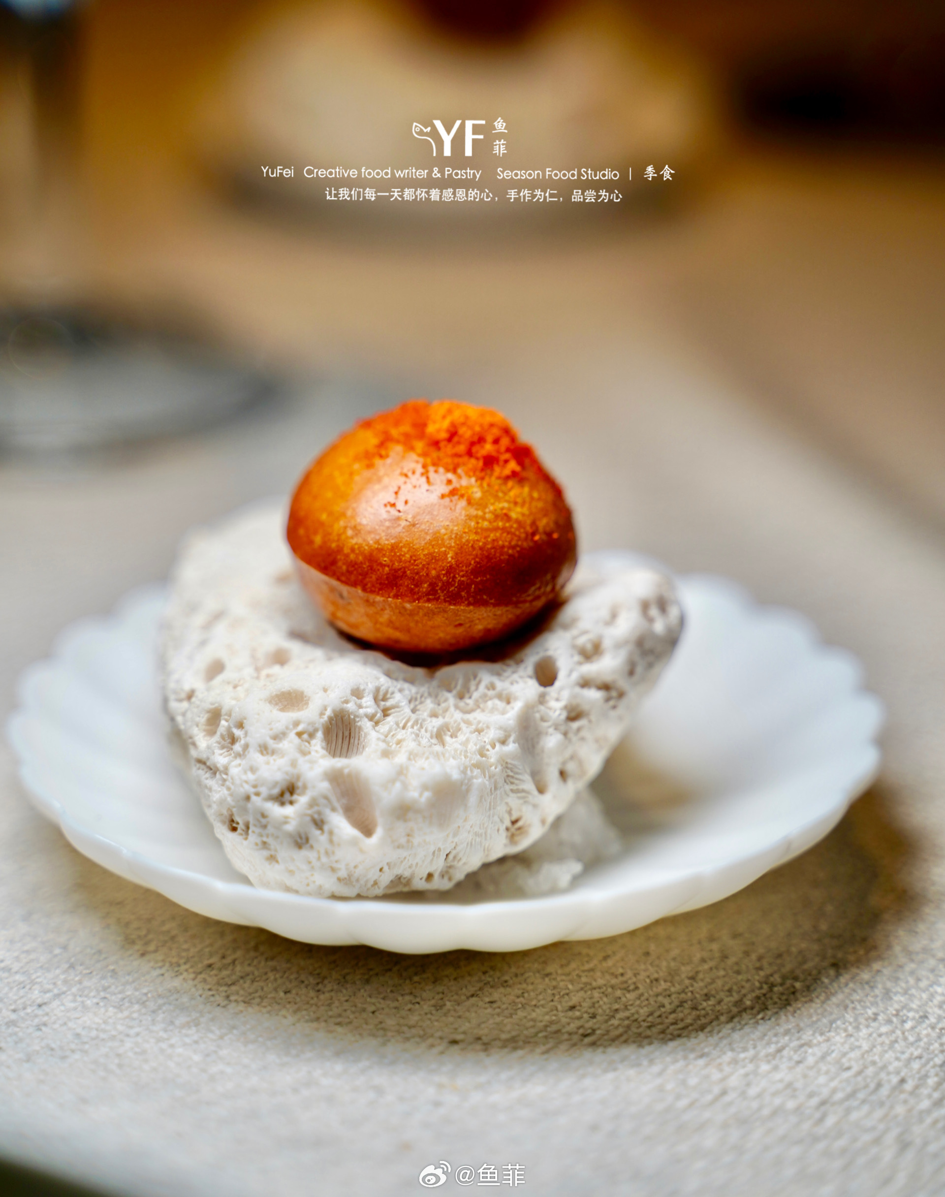 🍫另外用滁州青柚做内馅的羽毛造型的球型巧克力慕斯,红白色羽毛也是树莓和青柚两种风味。开头说的巧克力可可果树,用的是厄瓜多尔的单一品种可可豆,以及加入甜品师家乡广西的一种香叶,香气层次丰富。