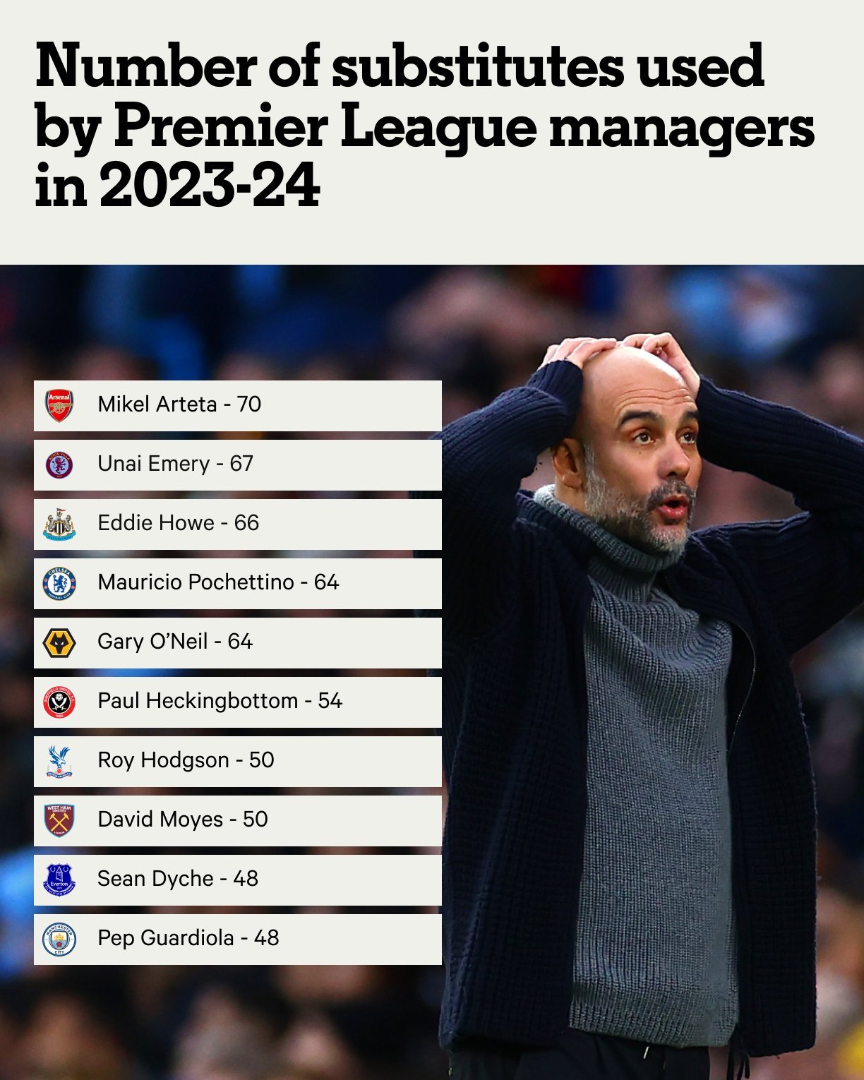本赛季英超使用替补人次最多的球队,布莱顿只有4次换人名额没用,曼城和埃弗顿浪费的名额最多。