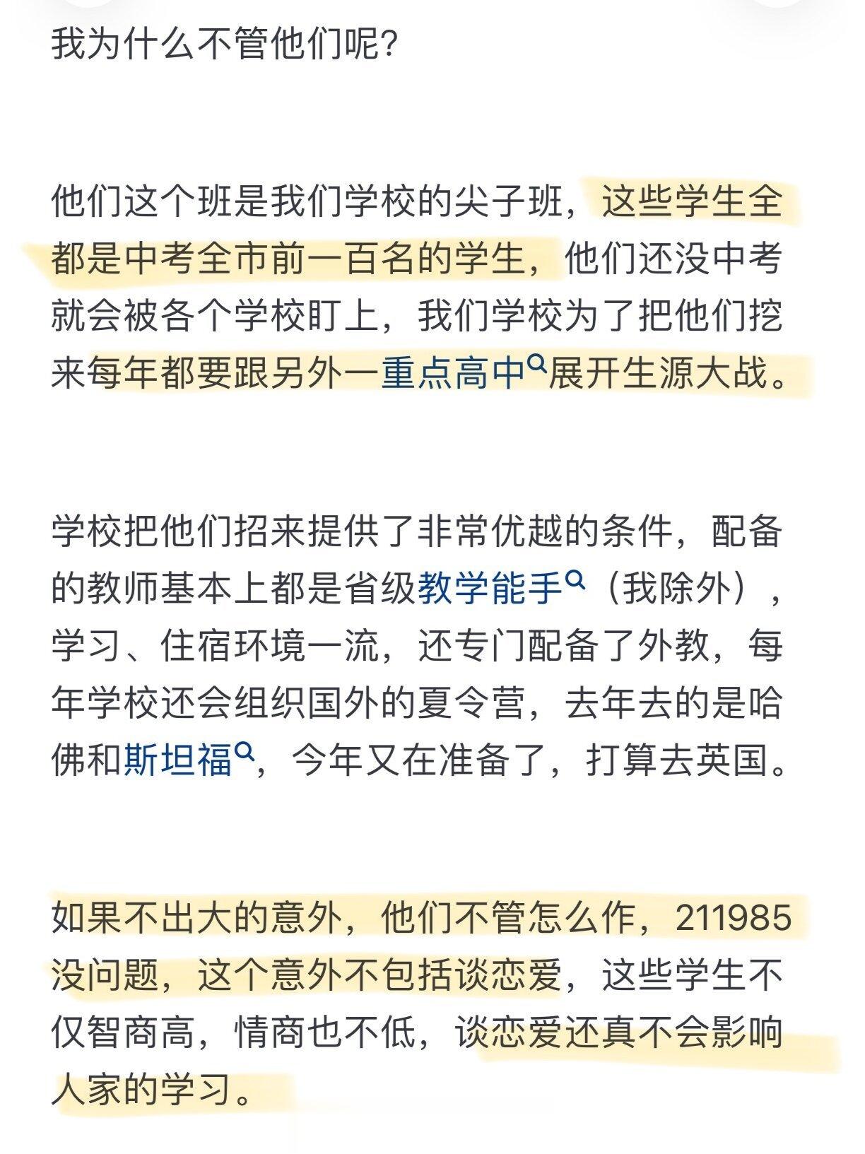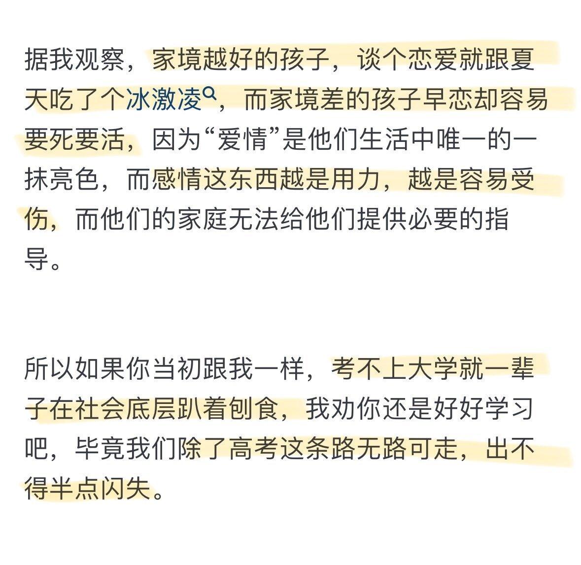 趴趴鱼 10 2024-02-12 09:51 高中恋爱的确会影响成绩,是不该恋爱的。可是没必要编这种小作文吧。分数88和70多的是全市前一百的孩子。。。。。是哪儿的分数呢。。。。老师觉得孩子的前途有父母呢,不需要他多操心。。。。是我上班就只是上班,不需要太在意孩子具体情况的教学态度么?? ♀拽★气※爺♂ 回复 02-17 08:29 所以你做一下江浙沪的卷子? 趴趴鱼 回复 ♀拽★气※爺♂ 02-17 09:53 所以问是哪儿的分数,感觉就算是江苏,88和70也不太可能全市前一百吧。你们江苏和浙沪不太一样,高中你们分数是不是和别的省都不同的?除了江苏,别的地方好像都是一百多分满分
