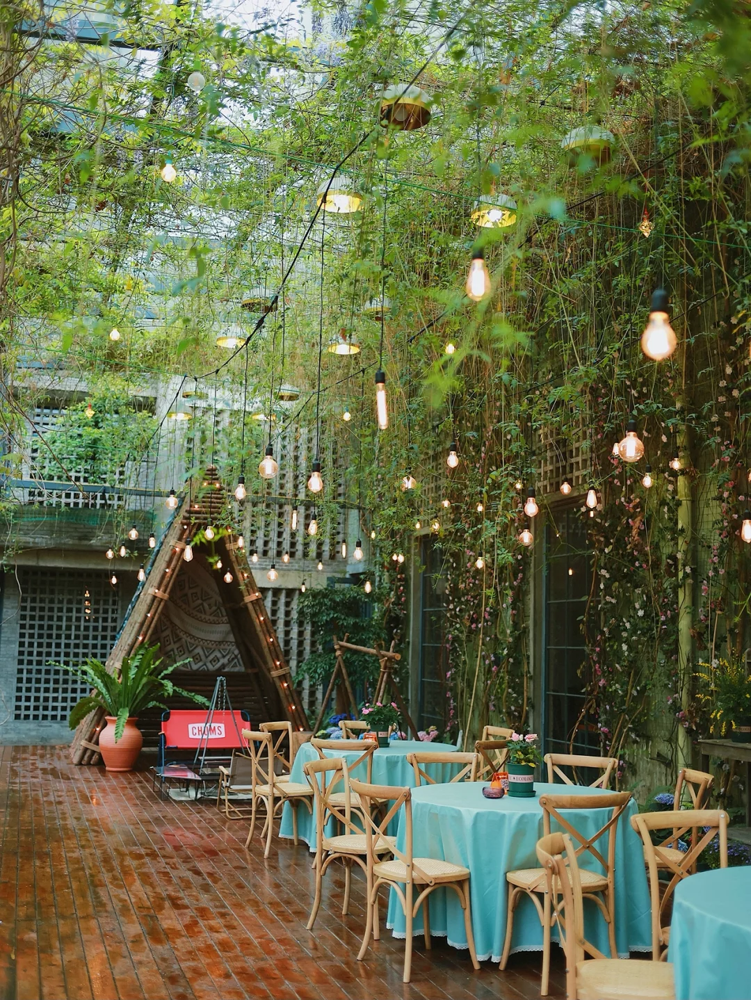🌧️武汉已经不记得下了多久雨了,在家实在关不住了,就约了姐妹聚餐!约的这家新开的餐厅给了我们大大的惊喜,居然可以在下雨天☔️在竹林的大帐篷下面撸串吃虾🦐围炉煮火锅🍲