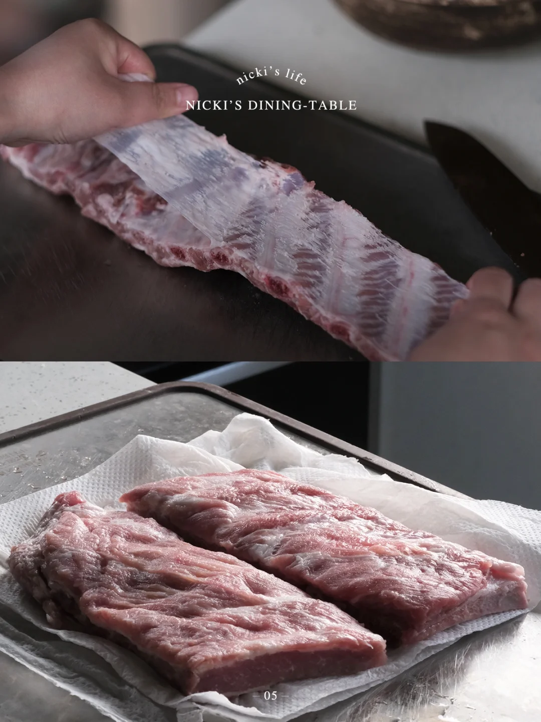 ·猪肋排撕去底部的筋膜层,厨房用纸吸干水份,用叉子戳一下肋排方便入味,表面抹上(大蒜粉、盐、黑胡椒、红椒粉、红糖)。