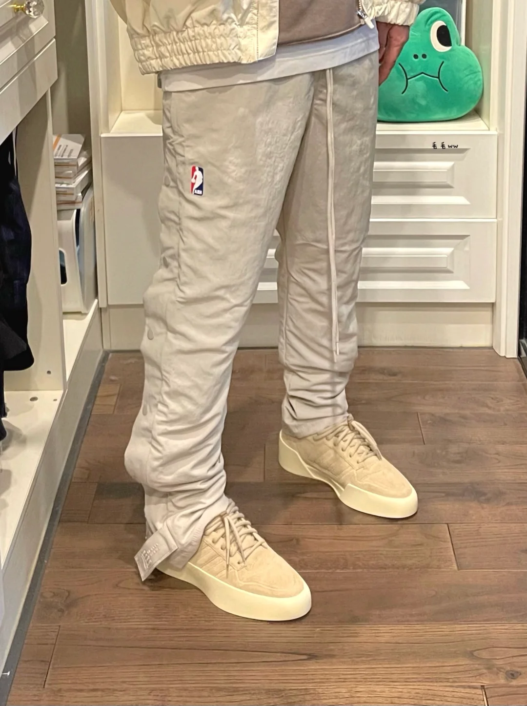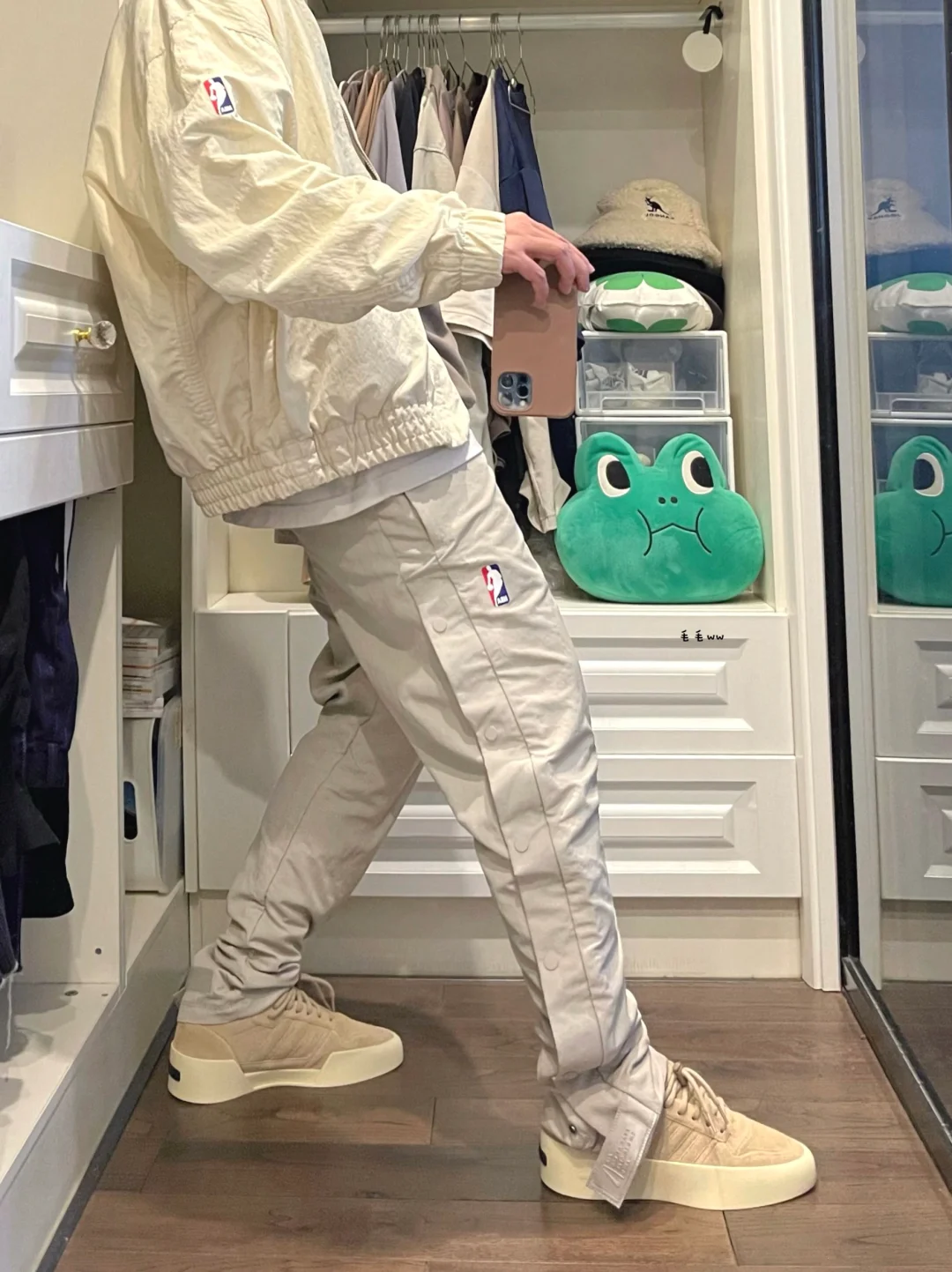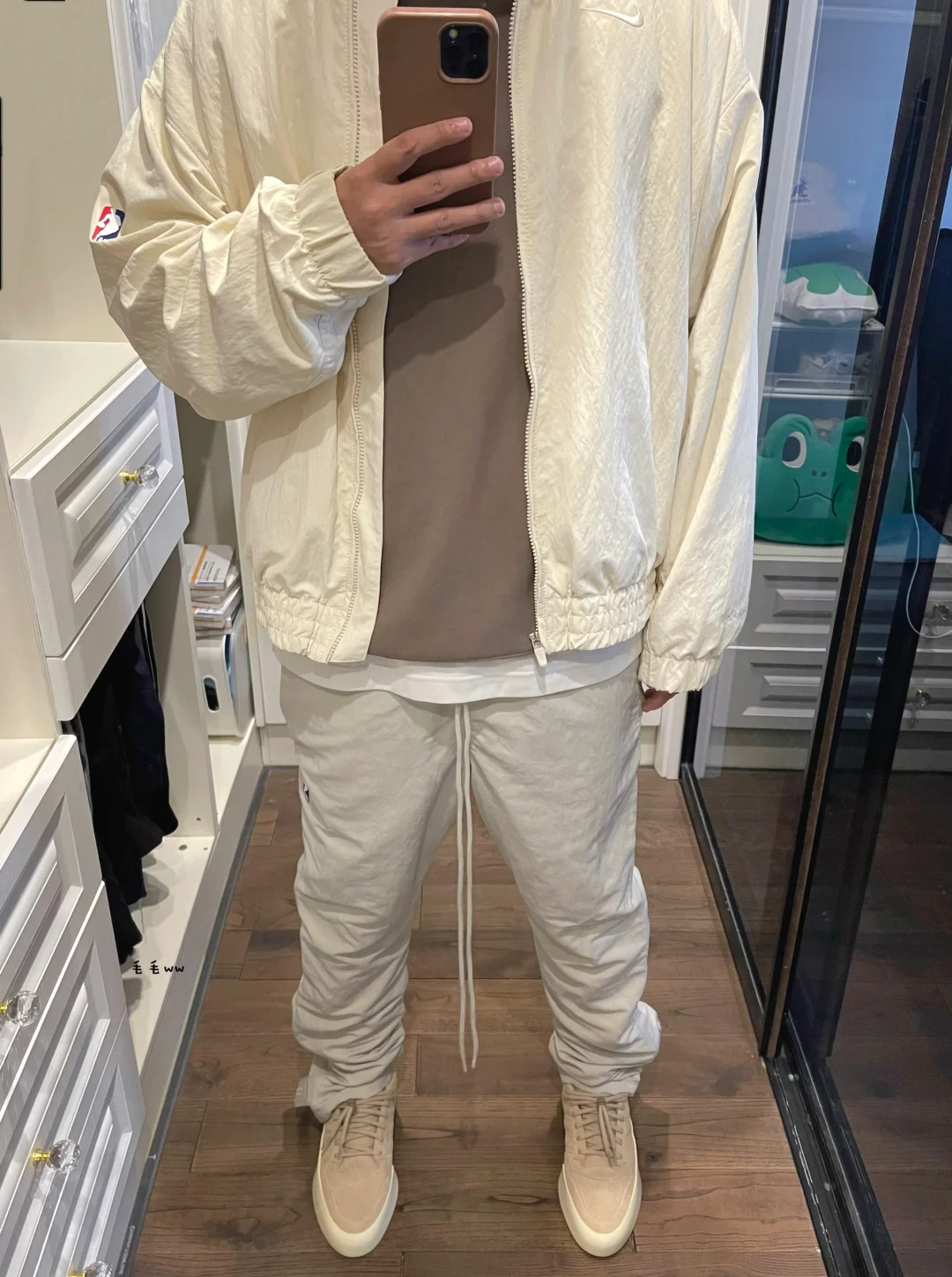 -为什么说FOG系列的一体性强,N家跟A家的联名都能随便搭配起来,毫无违和感 . -排扣裤很好结合了运动与街头;整套复古色调,低饱和度米色系,卡其浅棕点缀 . —————— . ✏️本人178cm75kg 球鞋尺码265mm(正常EU42) . 💭以上均为我个人观点,不喜勿喷,欢迎讨论。