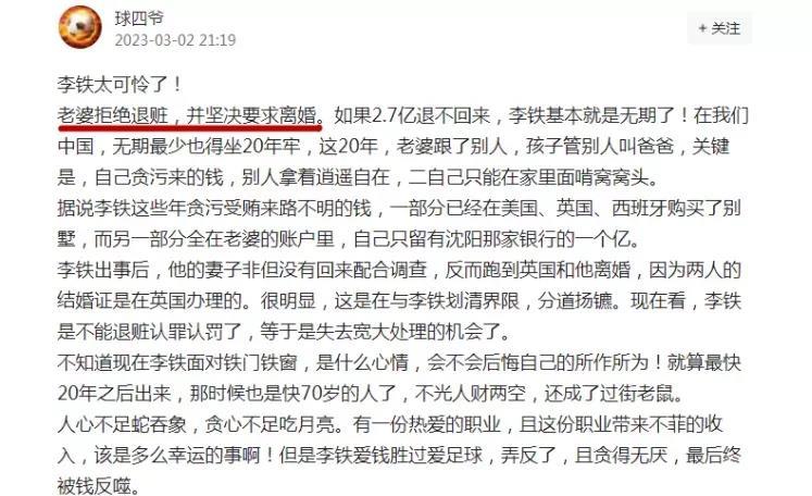 李铁的妻子拒绝退还赃款并准备离婚的问题已经不再是简单的夫妻关系问题,而是涉及共同犯罪和预谋的问题。然而,曲婉婷母女在国外大言不惭地为自己“发声”,这个例子摆在了我们面前,那么李铁的妻子会采取怎样的行动呢?如果赃款成功转移,她会不会也选择这样的方式呢?这个问题也许值得我们深思。