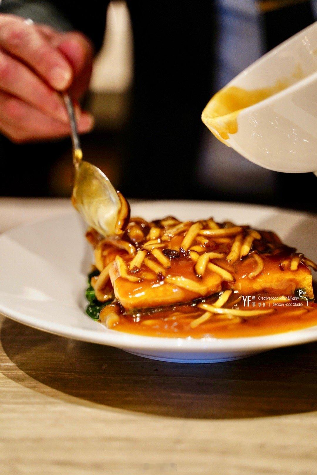 取浸非炸的工艺,控制油温最为关键。成品鱼外皮酥脆,内部依旧鲜嫩,淋上特调酱汁后,咸中透甜,鱼身弯曲头尾朝上迎客,就像鱼跃龙门的元宝,吉祥又喜庆。