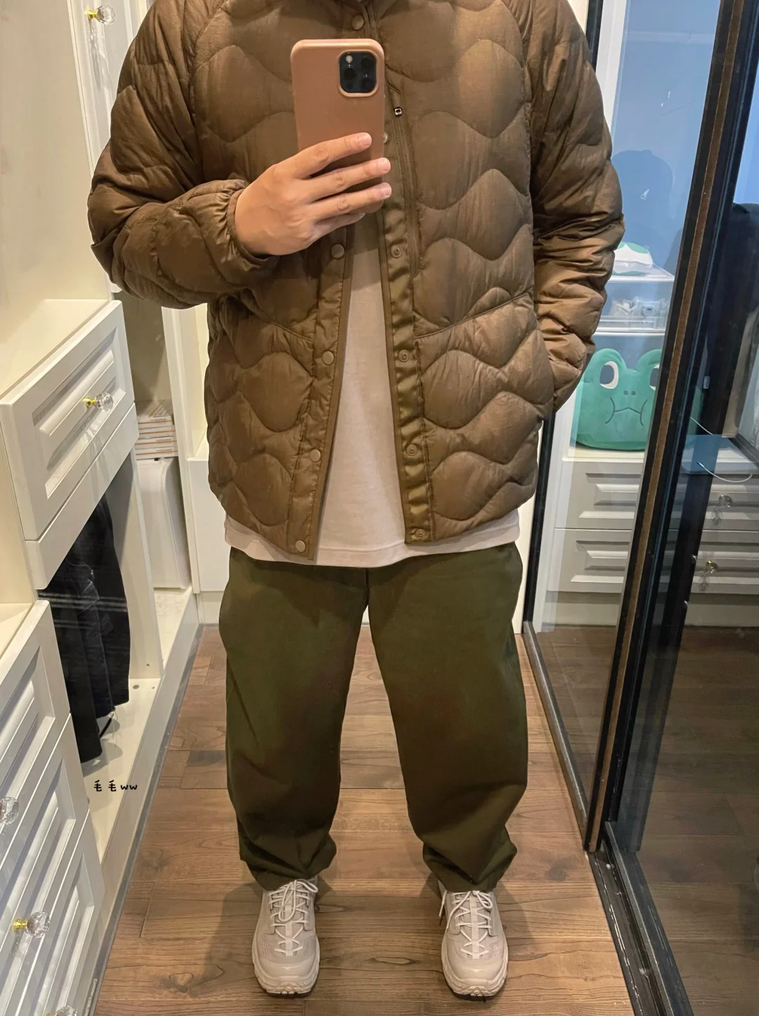 -优衣库这套褐色很耐看,实物栗色与橄榄的组合,非常秋冬的美拉德色调 . -绗缝羽绒服,可搭配性高;合身尺码方便内搭,宽松尺码更适合卫衣外穿 . —————— . ✏️本人178cm75kg 球鞋尺码265mm(正常EU42) . 💭以上均为我个人观点,不喜勿喷,欢迎讨论。