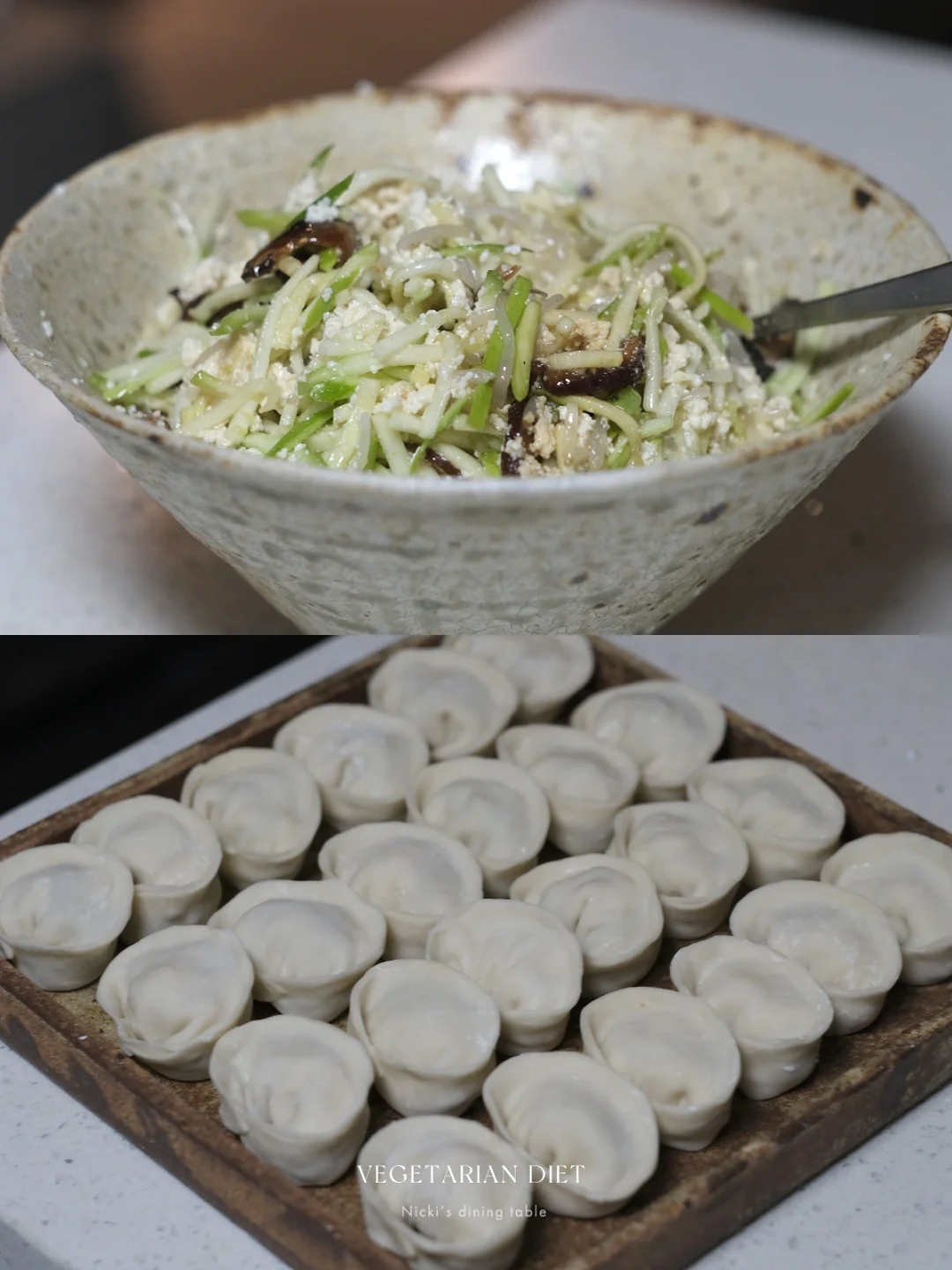 今天做的这款素饺子,适合不吃五辛,不吃蛋奶的素食者们。香菇的鲜,加上绵密的豆腐和爽脆的豆芽,口感很丰富……