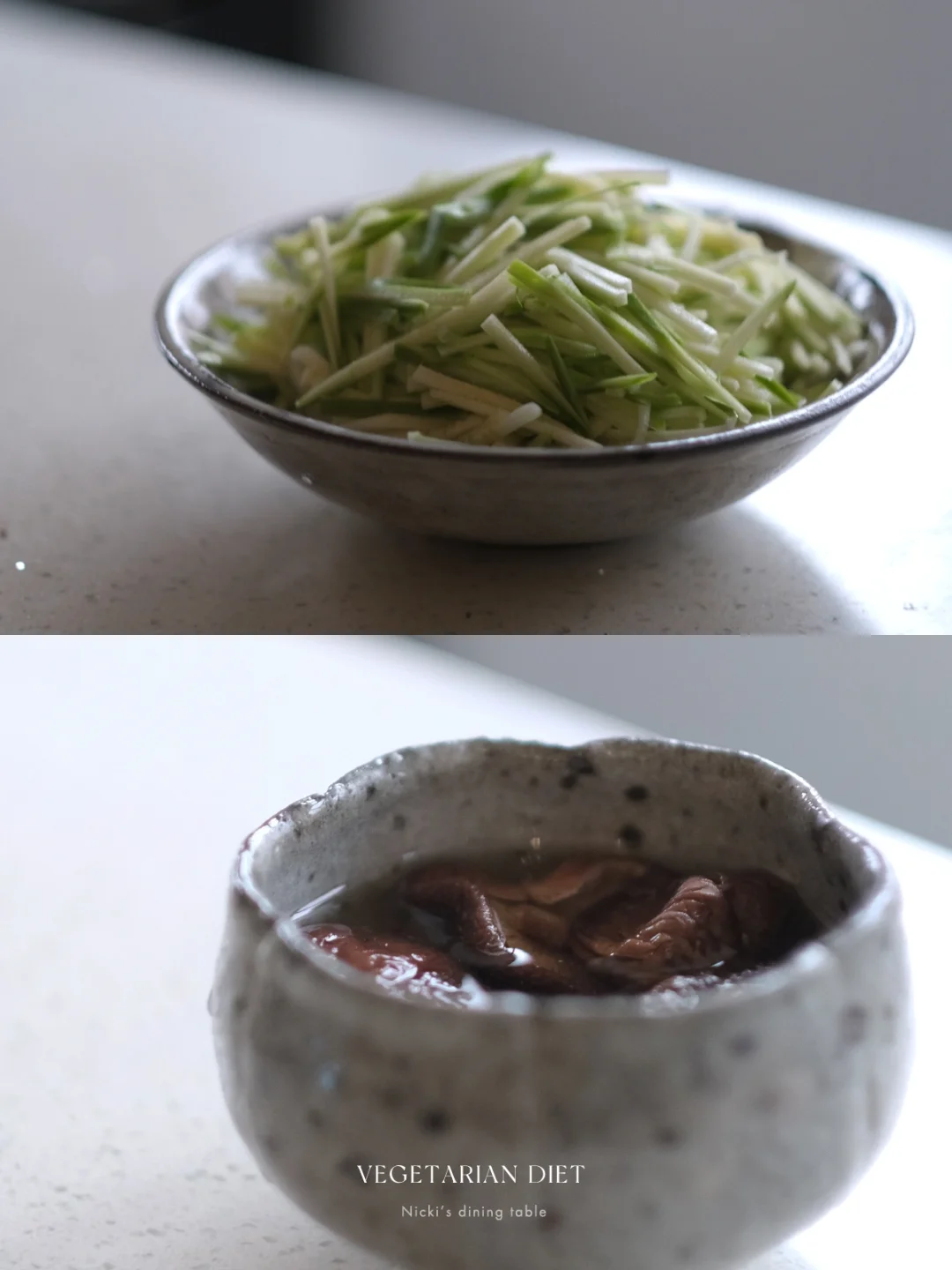 •干香菇用温水泡发1小时左右,挤去水份,去蒂,切丝,加2勺生抽、一勺芝麻油,拌匀(泡发香菇的水不要扔)。