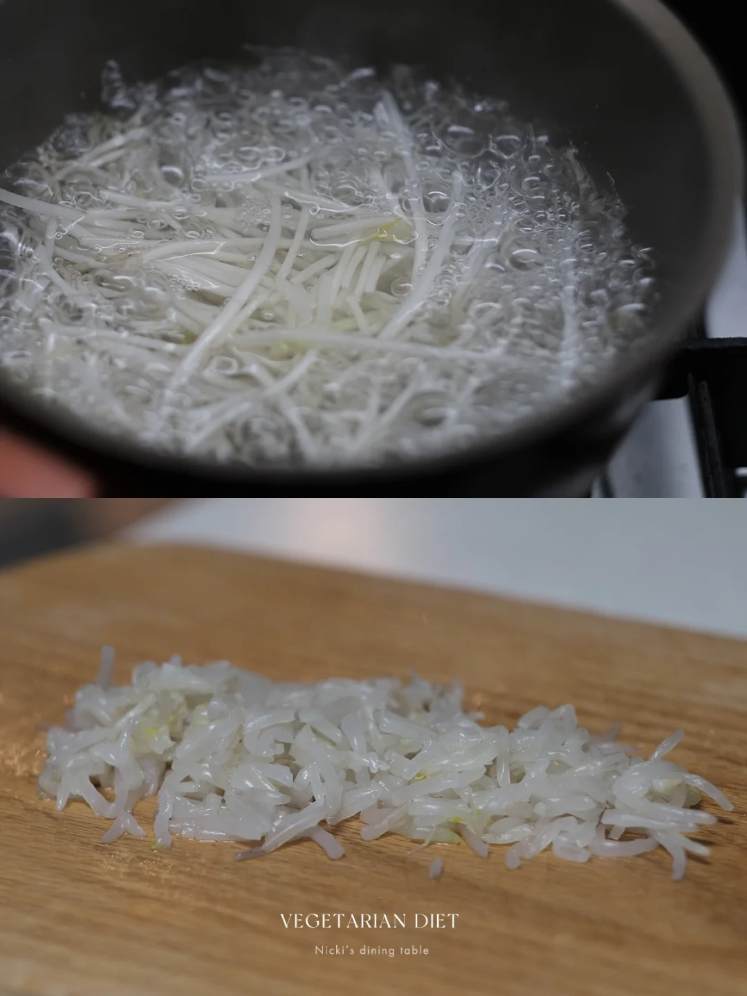 •绿豆芽掐头去尾,热水汆1分钟左右,冷水冲洗,挤去水份,切指甲盖左右长短的小段。