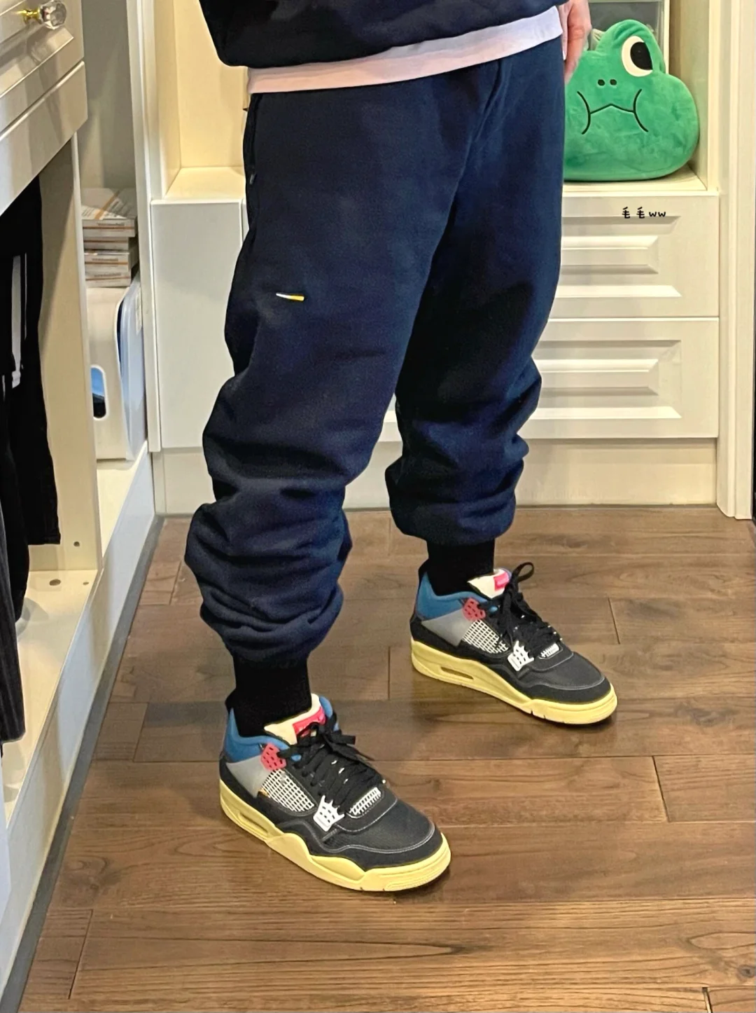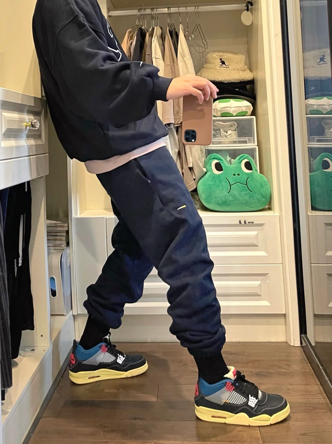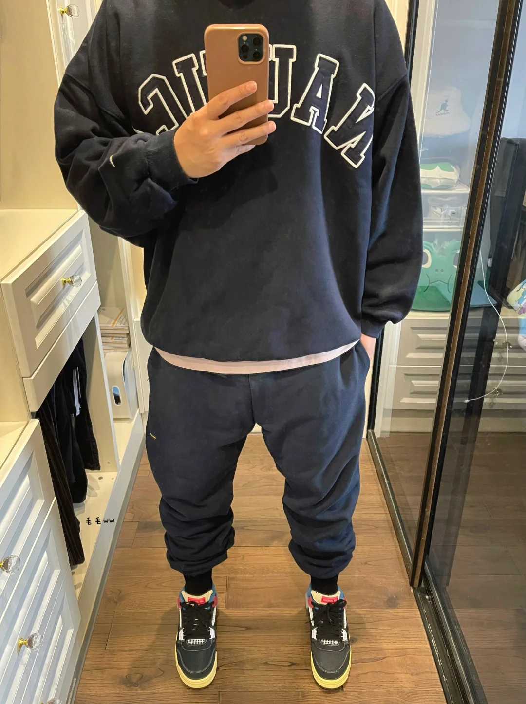 -藏青色系,高饱和度蓝色,不在灯光下接近黑色,所以蓝黑色调的搭配非常和谐 . -卫衣卫裤的懒人穿搭,个人比较喜欢舒适的氛围感,束脚裤也可以匹配各类球鞋 . —————— . ✏️本人178cm75kg 球鞋尺码265mm(正常EU42) . 💭以上均为我个人观点,不喜勿喷,欢迎讨论。