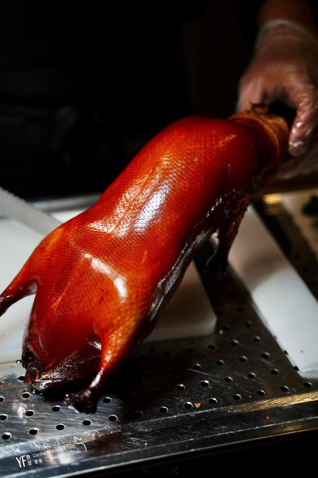 厨师桌边现片,口味也不错,一百出头一整只这个性价比真的绝,棕红色的外皮,烤的极好。