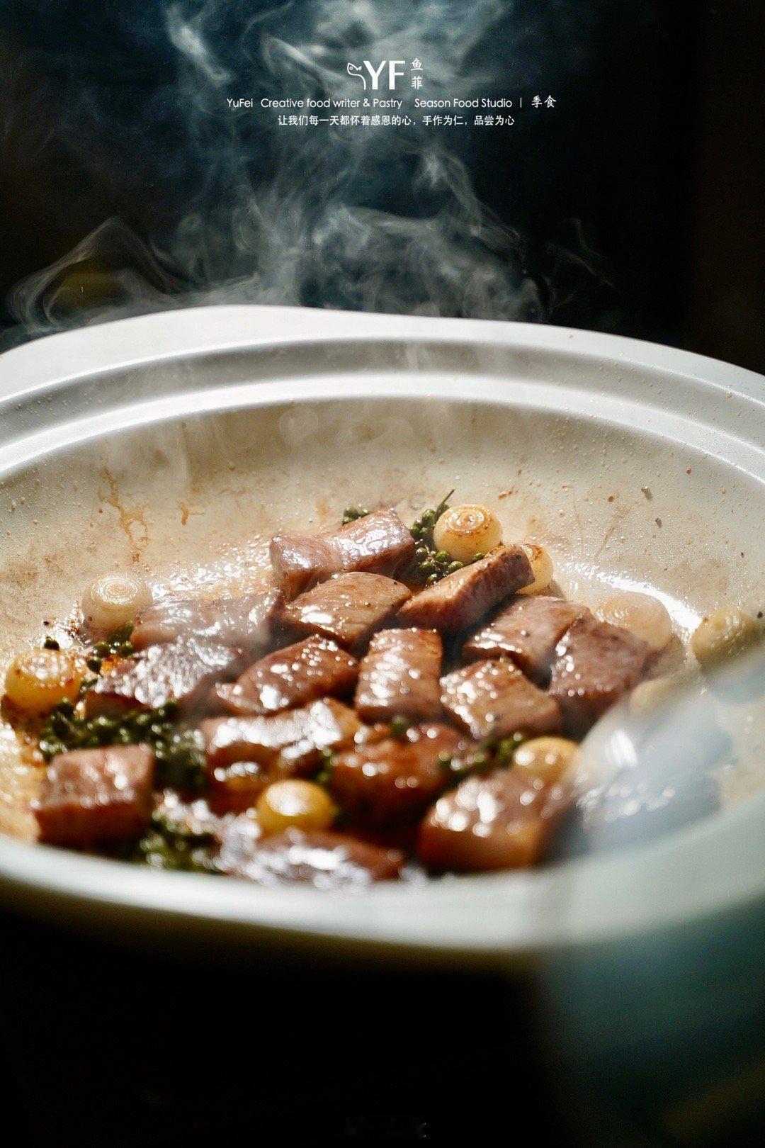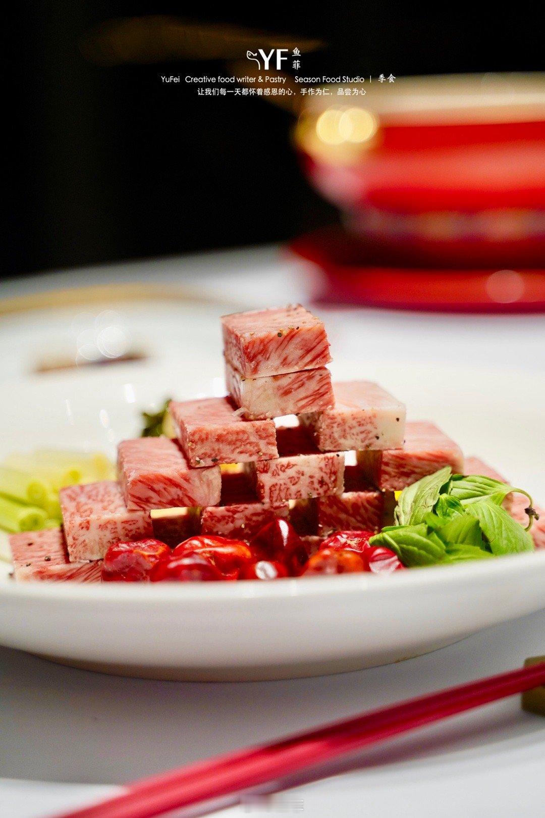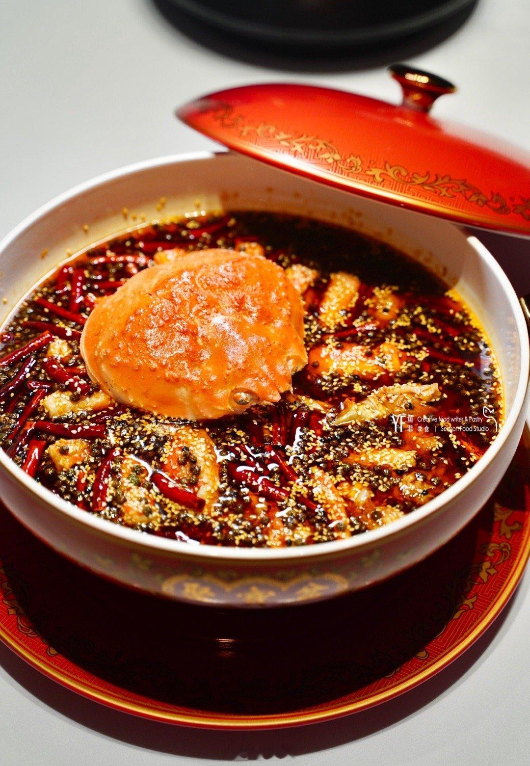 吃过许多松叶蟹的做法,用口水鸡的蜀湘做法倒是头一次,尤其是浸润了滋味的肥肠,每一块都是厚切的肠头,肥糯鲜香。蟹肉微微的麻辣,口口生香,搭配下面的莴笋,脆爽。上桌的仪式感也很喜庆,金色雕花的朱砂红砂锅,色泽好似古代神话中天之四灵之一的“朱雀”,属火,透着天穹祥瑞的美好寓意。