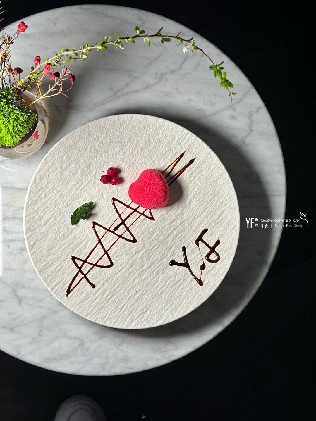 如果运气好,遇上蓝带毕业的主厨boss在,有机会能享受到亲手为你点名祝福的运气,尤其是情人节求婚,心形慕斯是不错的选择。
