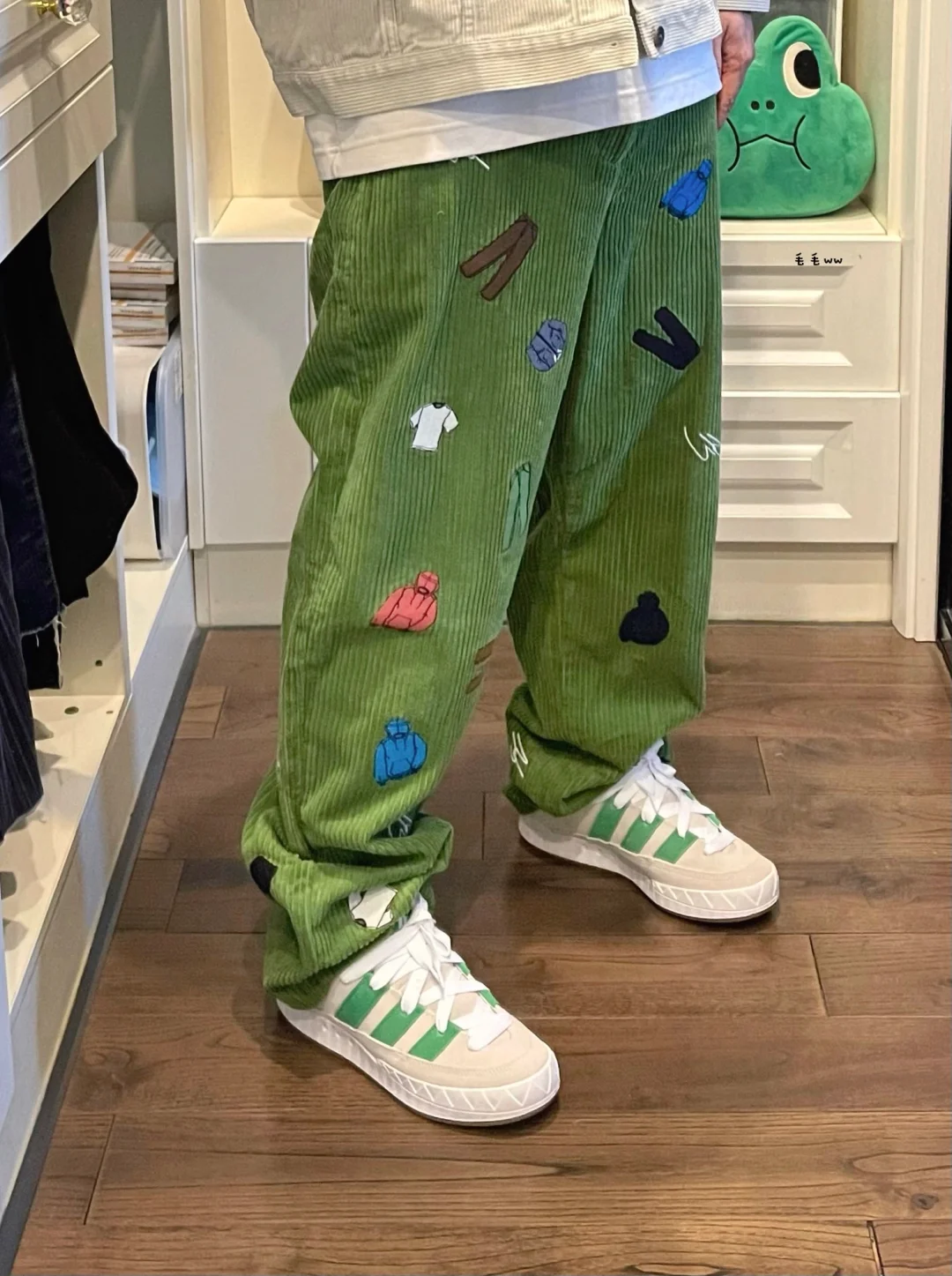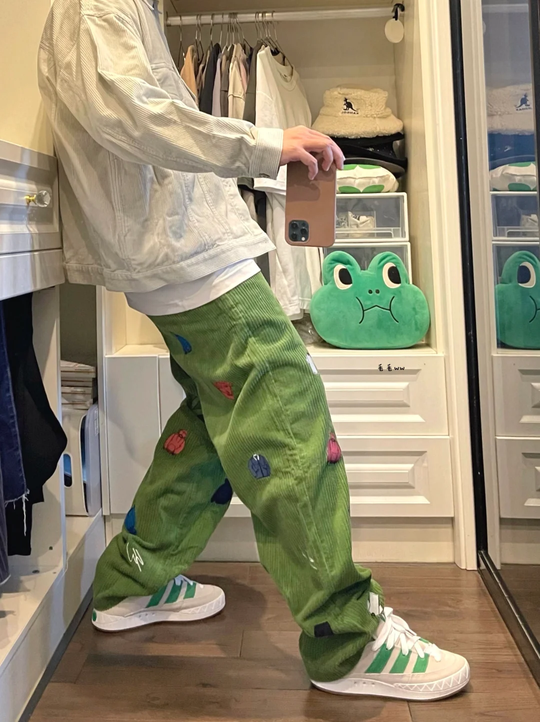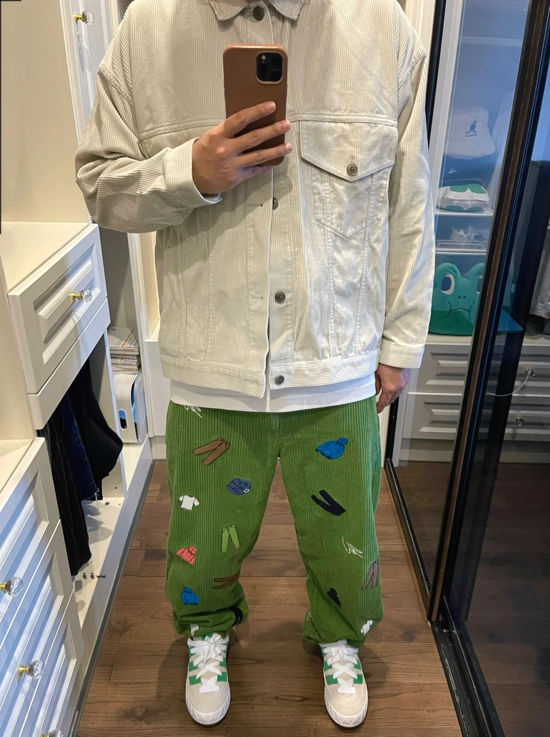 -秋冬季喜欢着用灯芯绒的单品,单看就有治愈的质感,摸上去的手感温暖适合当下 . -极少穿亮色,这条绿裤非常大胆;满印刺绣是SW惯用的细节,材质重磅些更完美 . —————— . ✏️本人178cm75kg 球鞋尺码265mm(正常EU42) . 💭以上均为我个人观点,不喜勿喷,欢迎讨论。