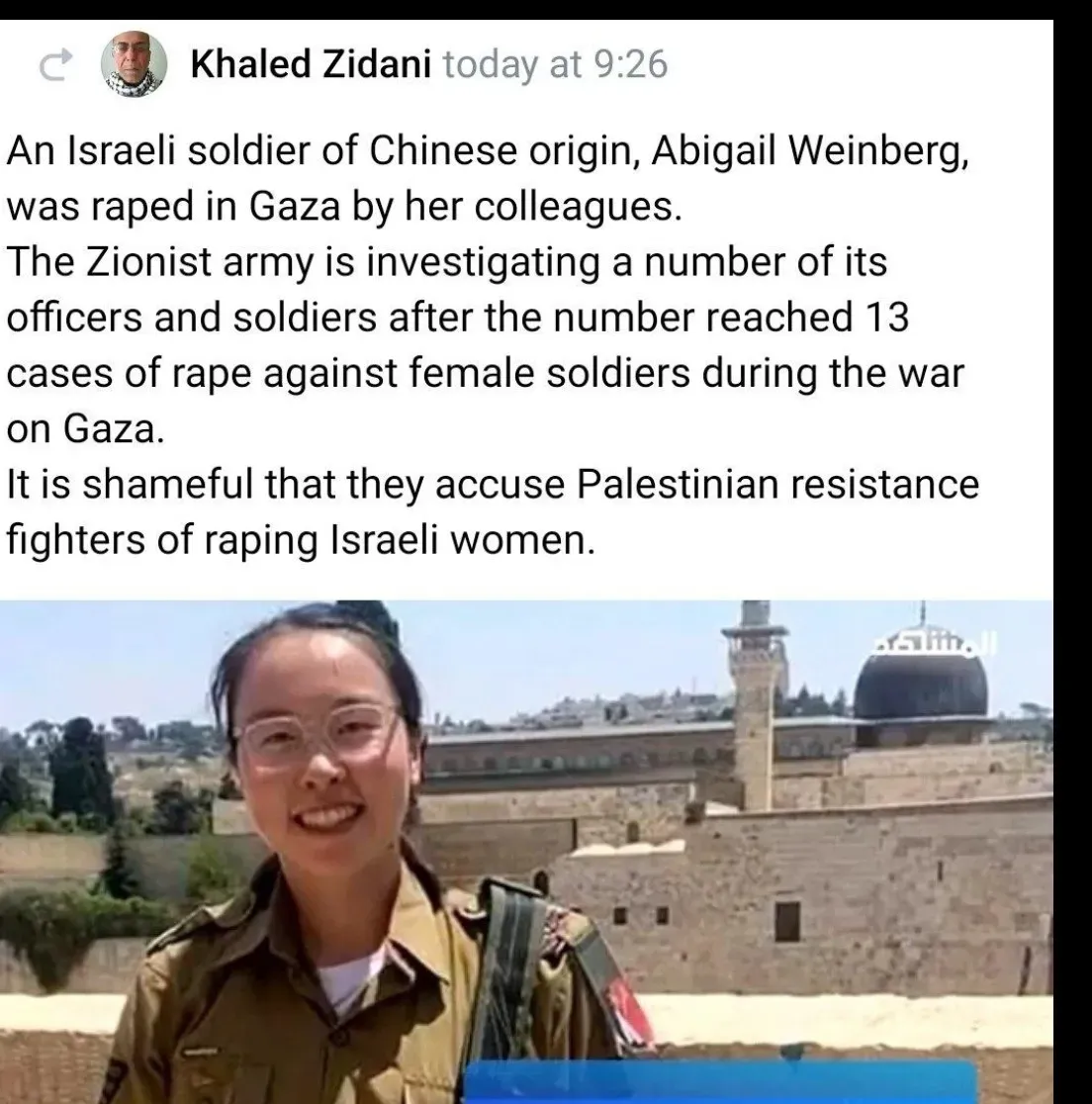 那个加入以色列军队,改名叫"阿比盖尔.温德伯格"的开封犹太人,被强奸了,而且是被战友强奸了!