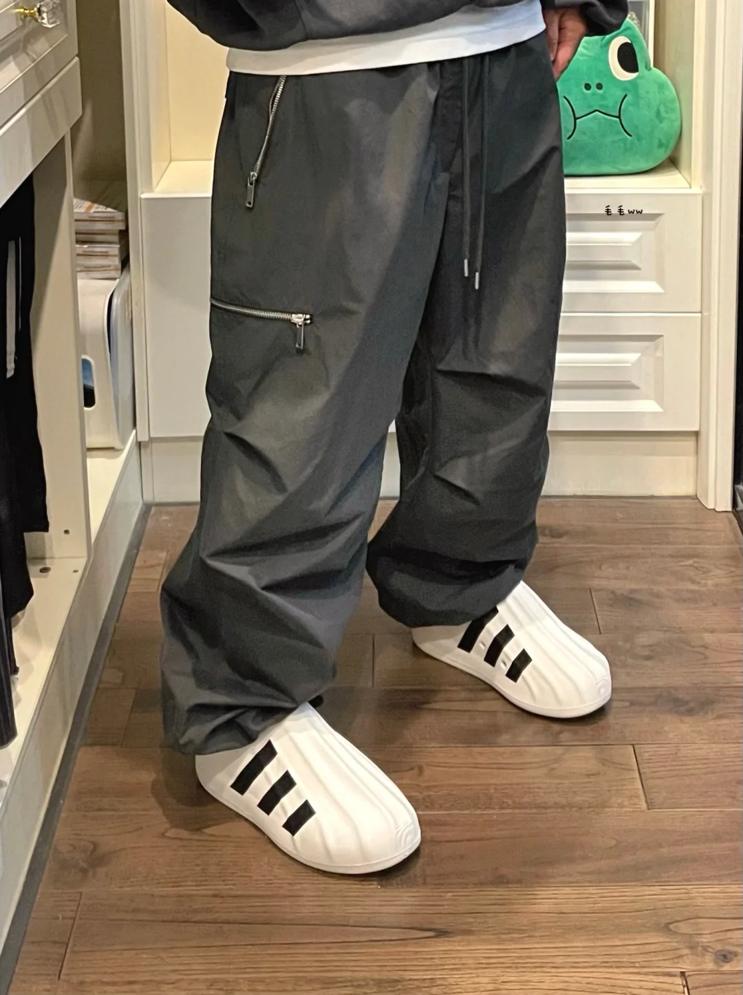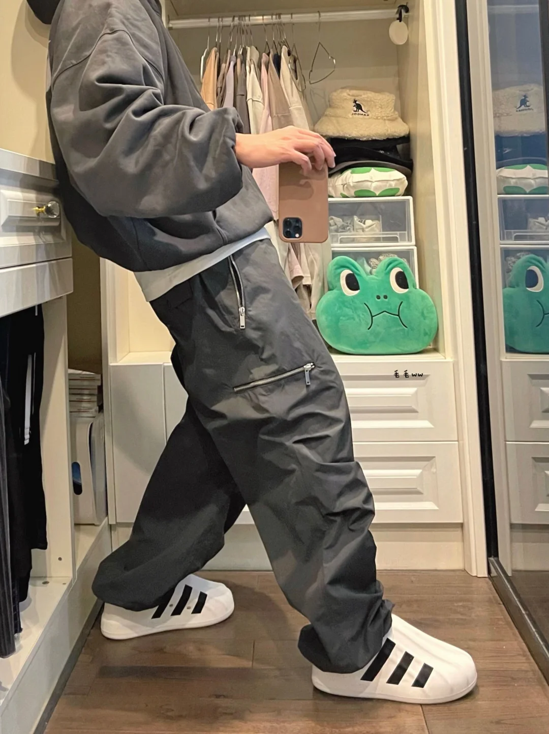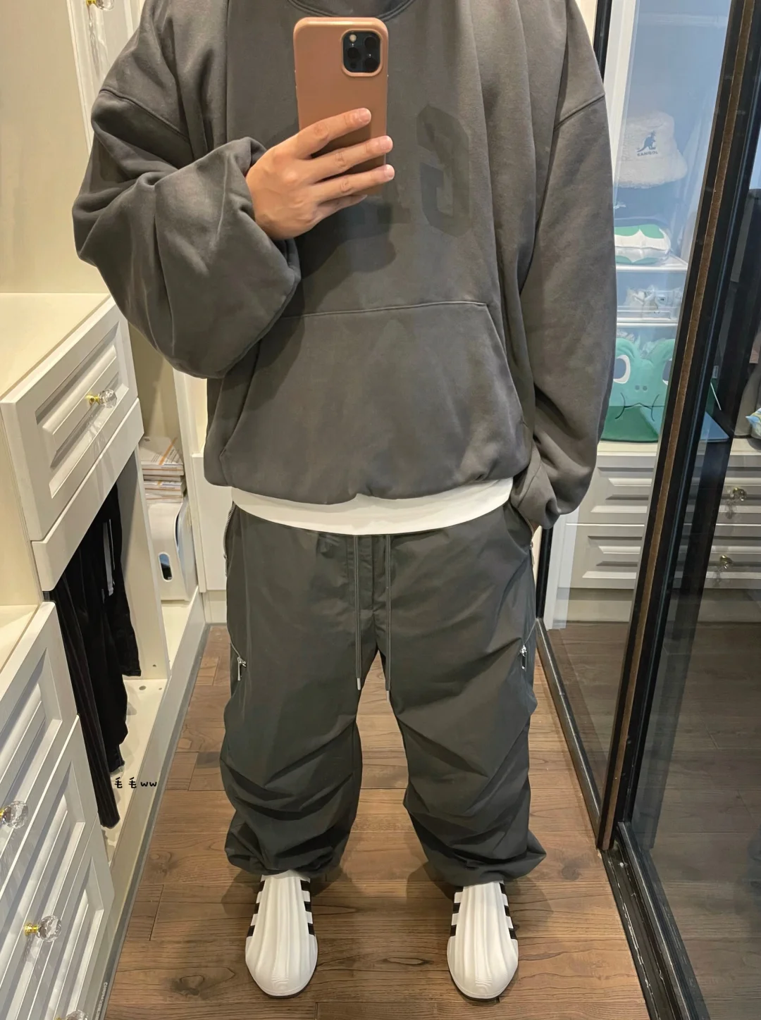 -高级青灰色,格雷系男孩又来了 -和平鸽帽衫,主打一个宽松廓形 -降落伞长裤,裤脚抽绳随意变换 . —————— . ✏️本人178cm75kg 球鞋尺码265mm(正常EU42) . 💭以上均为我个人观点,不喜勿喷,欢迎讨论。