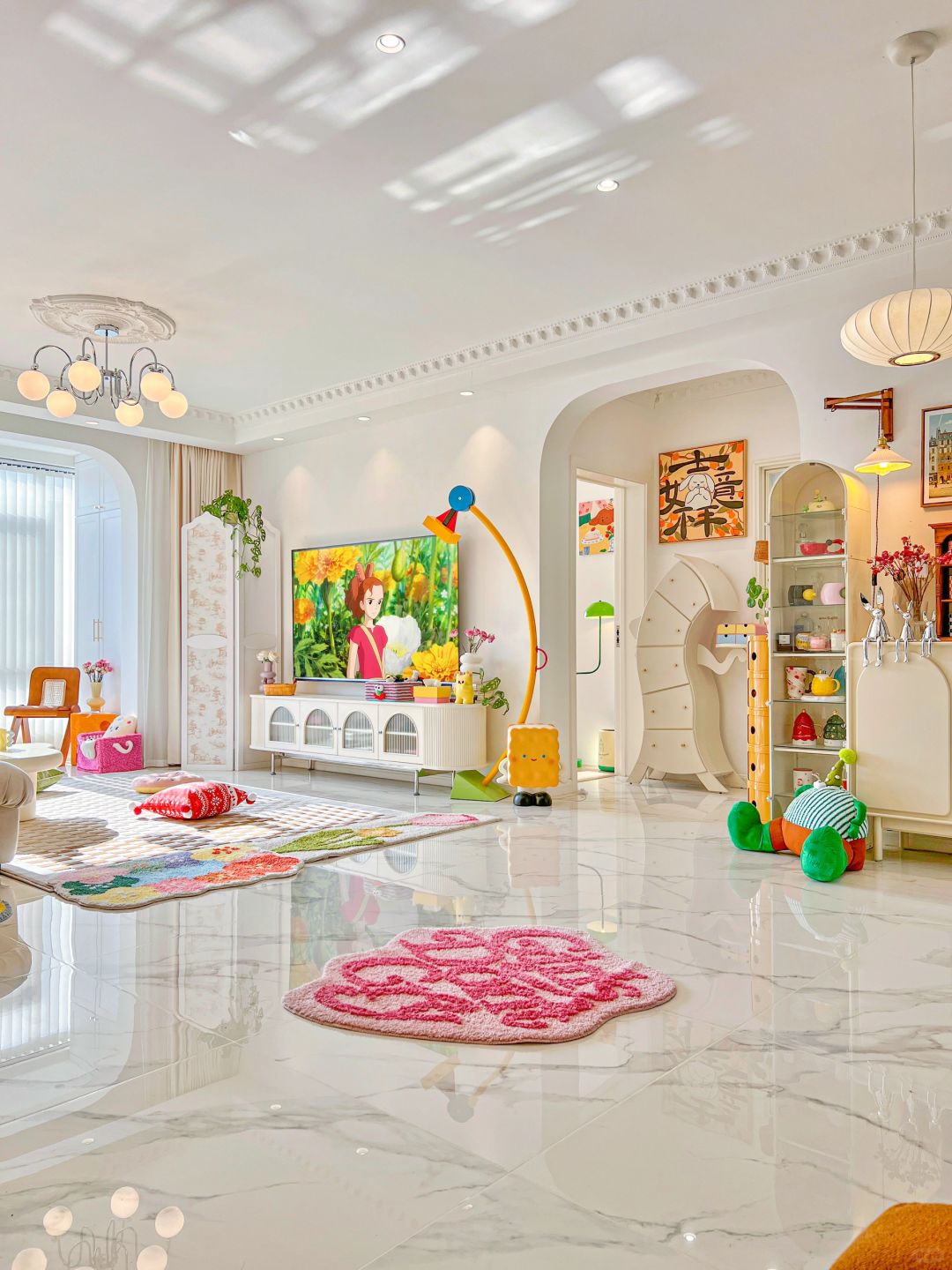 地砖规格80×80cm,大面积白色基底,搭配白色美缝
