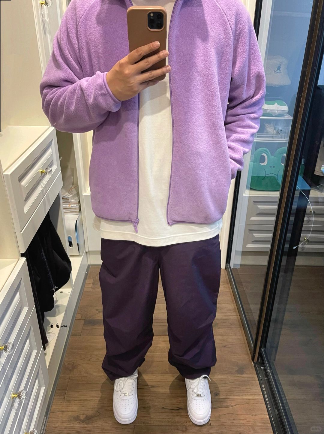 -区别于平时熟悉的优衣库极简,蓝紫搭配绛紫,这套绝绝紫穿搭让人眼前一亮 . -摇粒绒外套&降落伞长裤,干净球鞋与同色内搭,穿着感受视觉效果同样舒适 . —————— . ✏️本人178cm75kg 球鞋尺码265mm(正常EU42) . 💭以上均为我个人观点,不喜勿喷,欢迎讨论。