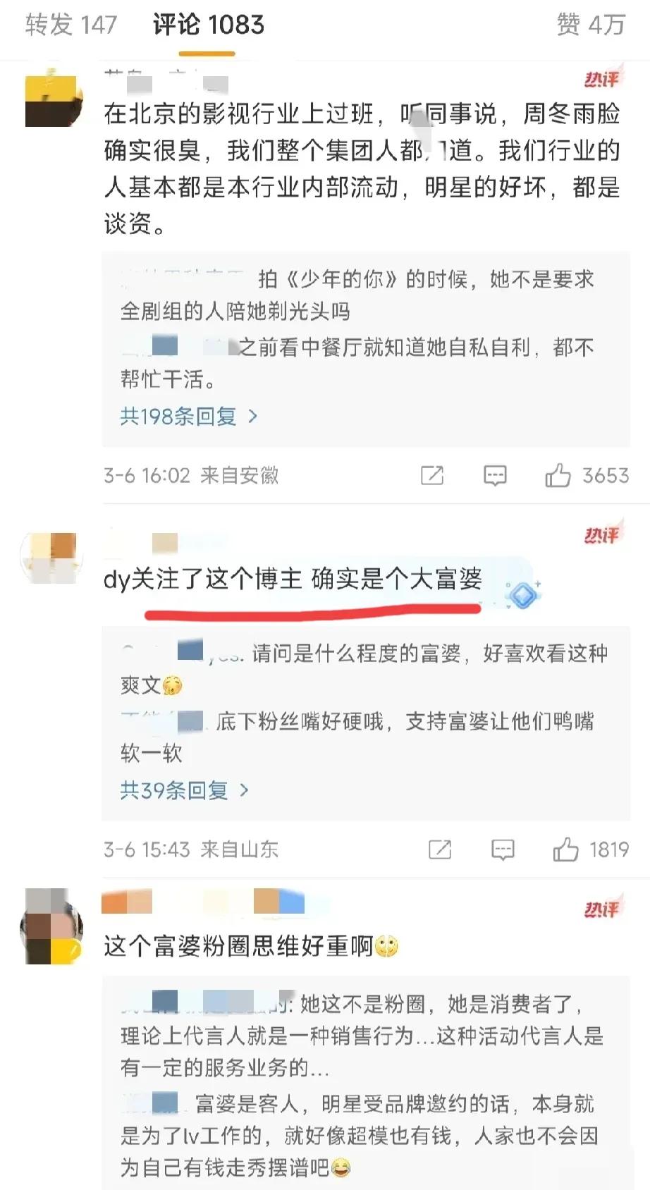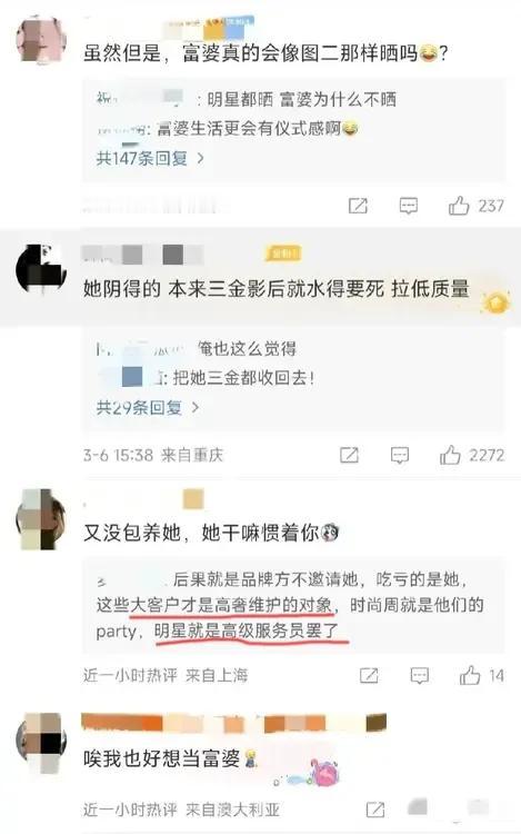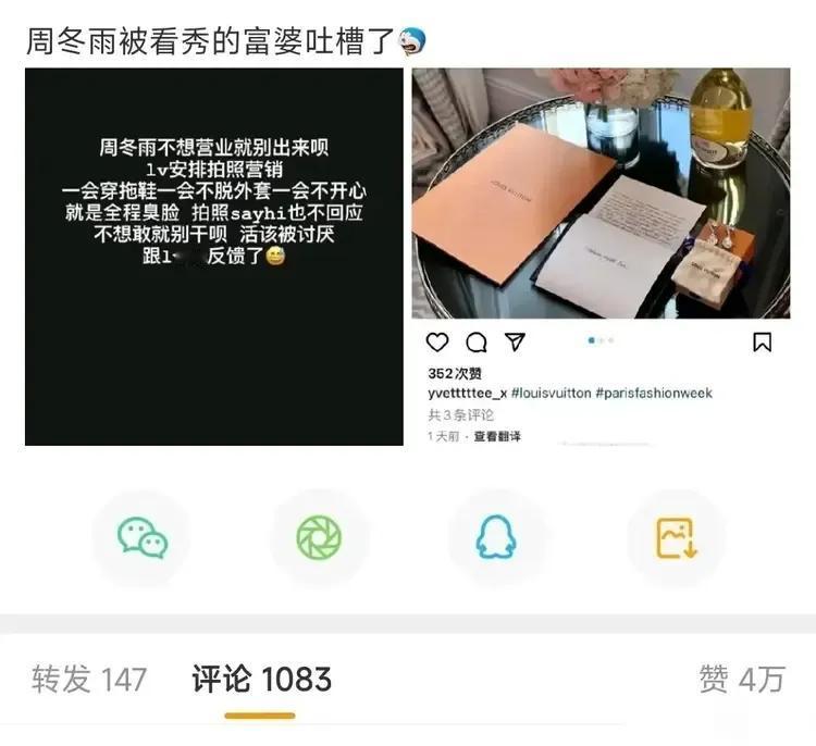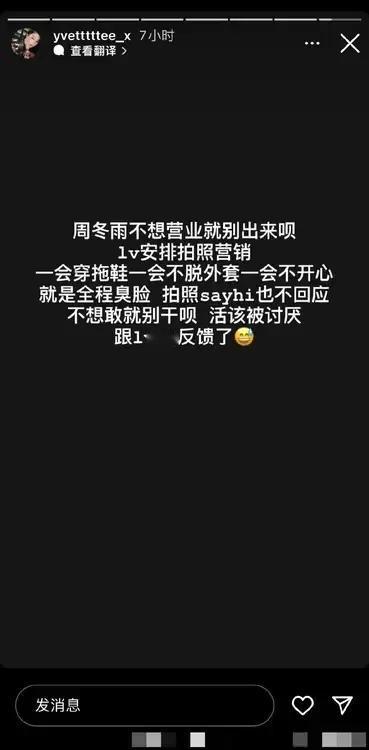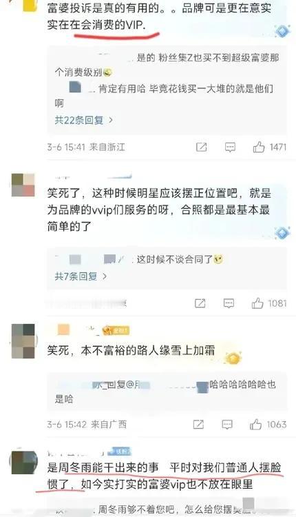 🈶位去看秀的富婆向LV投诉了周冬雨。这位富婆称周冬雨在品牌要拍照时不配合,服务态度很差。而且,估计富婆作为LV的VIP有份围观她拍照,还跟她say hi了,但只得到周某的臭脸,所以把富婆姐姐给气到了…… 作为代言人,拿了别人的title,拿了别人的钱,在工作时不配合,就…挺不专业的…… 不知道富婆姐姐的投诉力度有多大呢[黑线]?