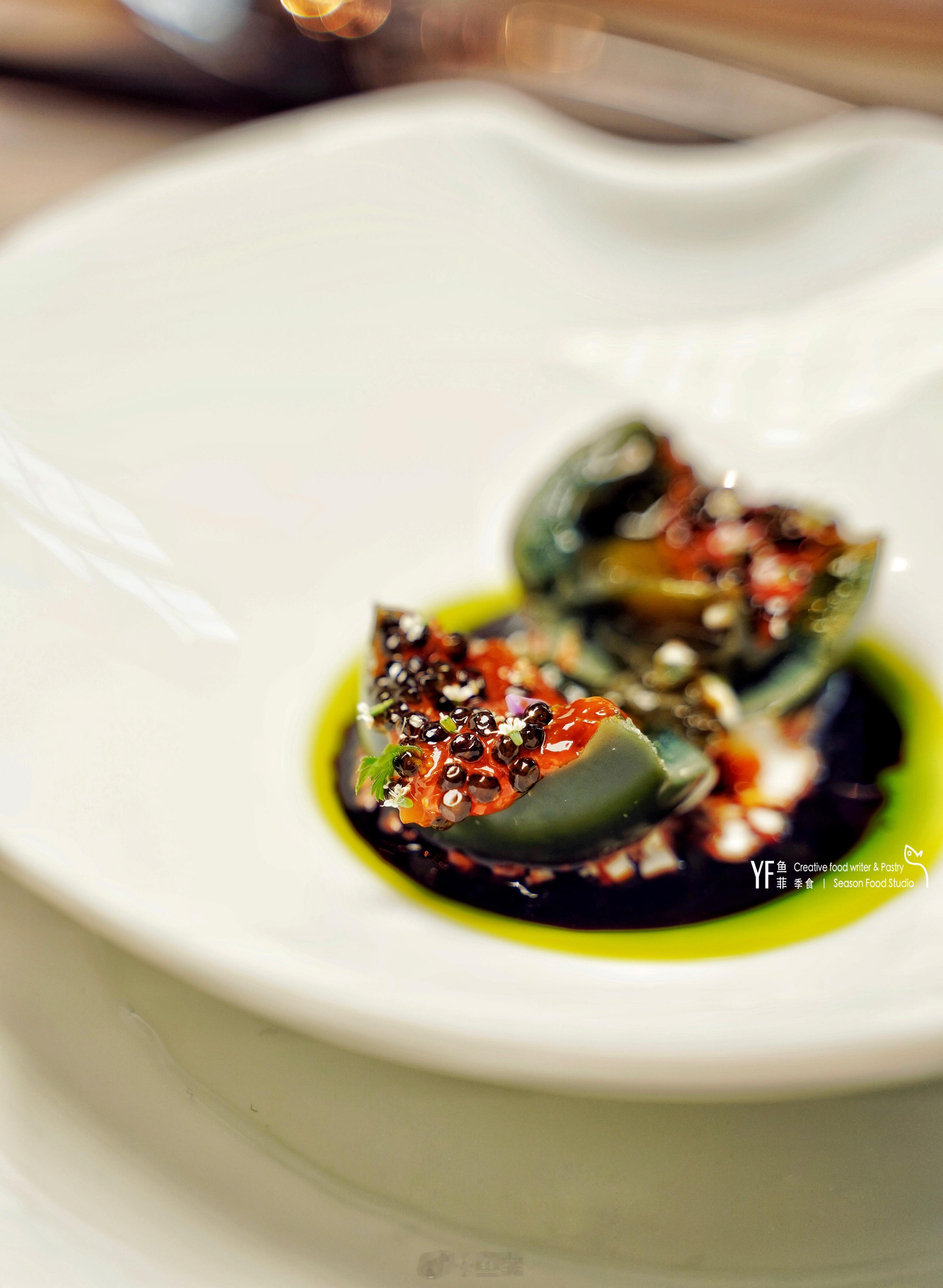 第一轮惊喜来自“溏心皮蛋”,主厨匠心独具,取宁波醉膏蟹的蟹糊拆壳取黄,与鱼子酱同酿其中。底部佐意大利黑醋、青葱汁、豆乳汁,搭配入口酸甜醇鲜,似冰淇淋绵密慢化于舌尖,三种酱汁馥郁,惊艳!