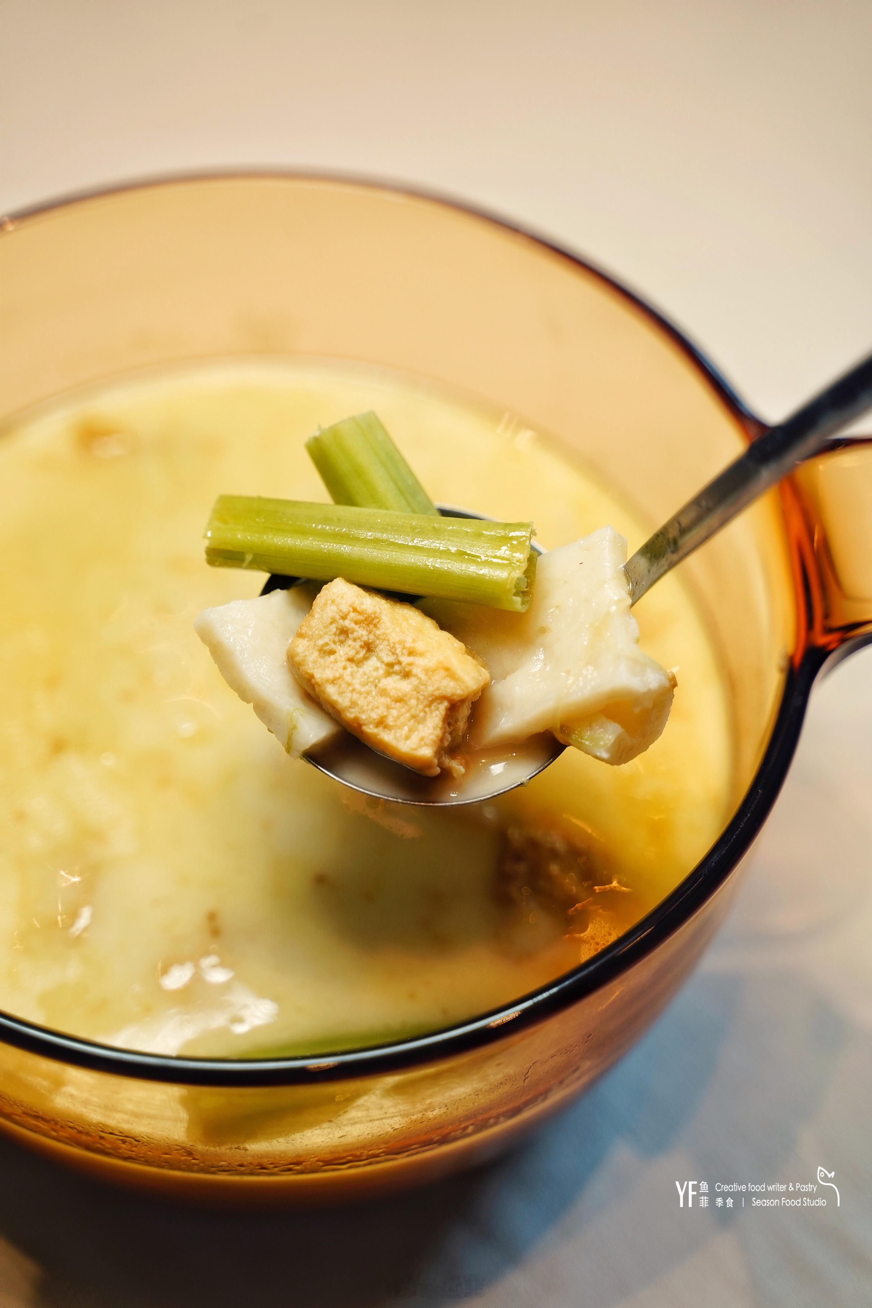 第三喜,则是当季的东海鲳鱼铺,取8两大的鱼身去刺厚片,嗲就嗲再将三月暮春的笋子和酱油肉切丁入馔,山野腊味的双重点睛,鲜上加鲜。