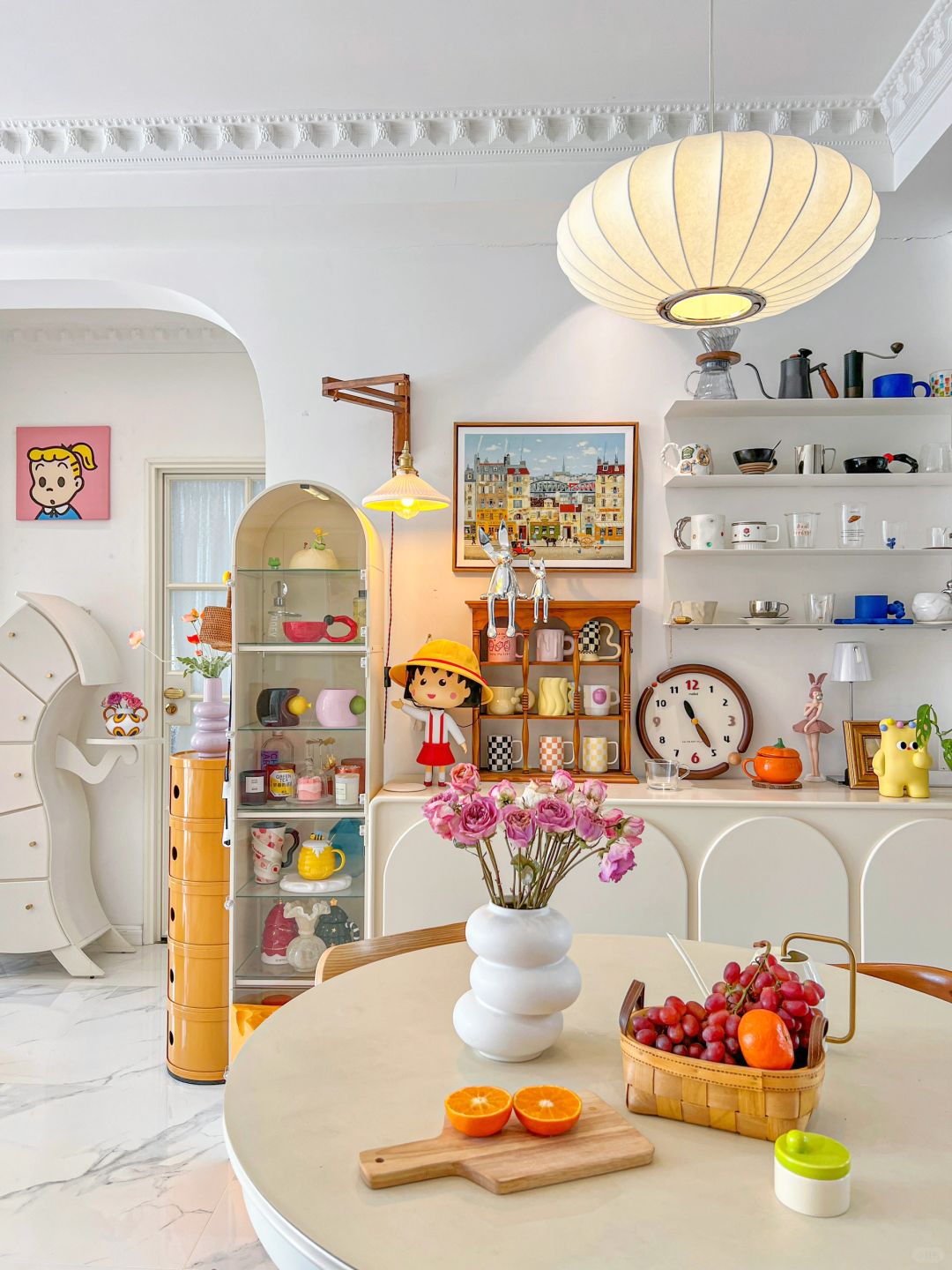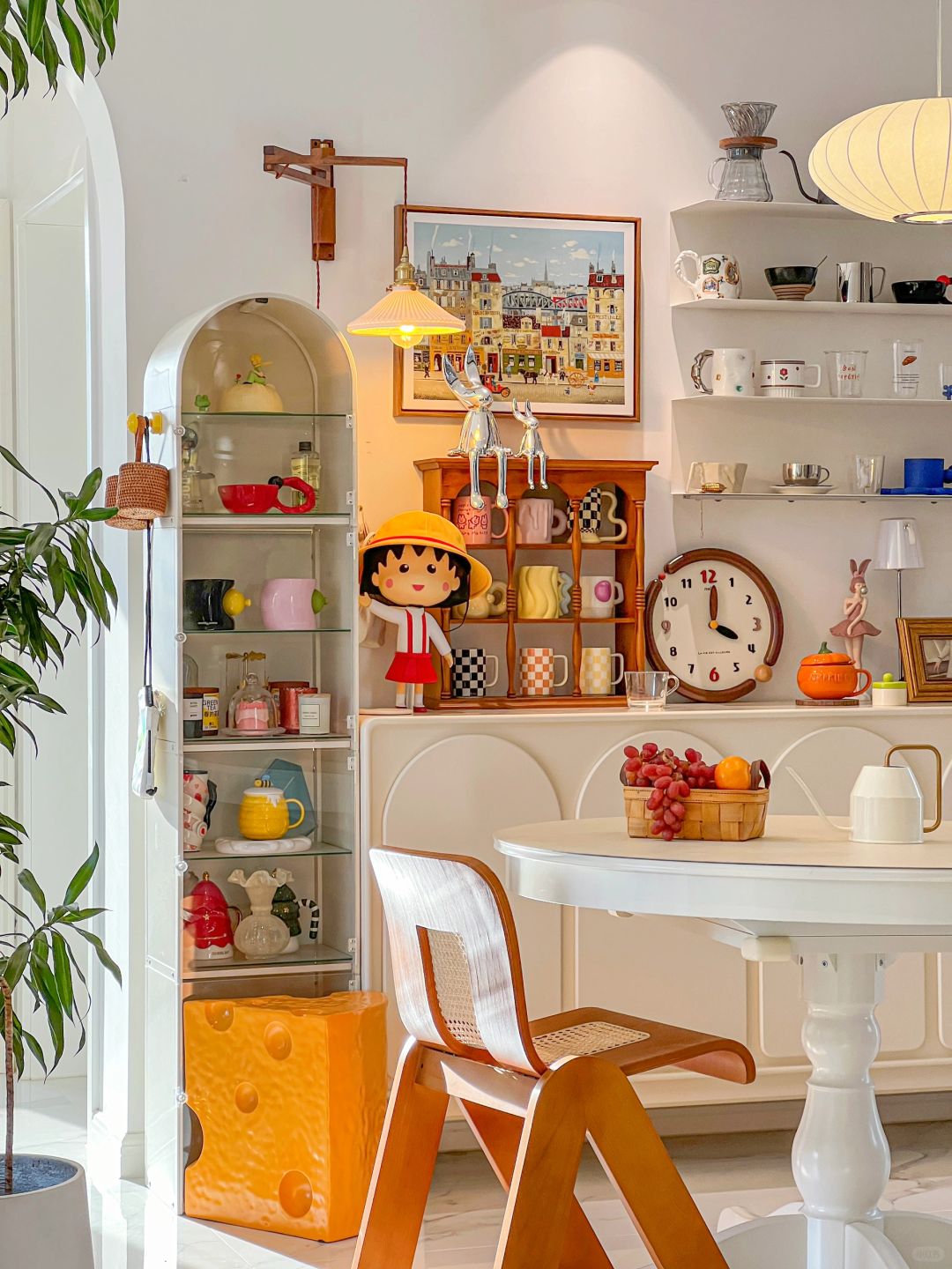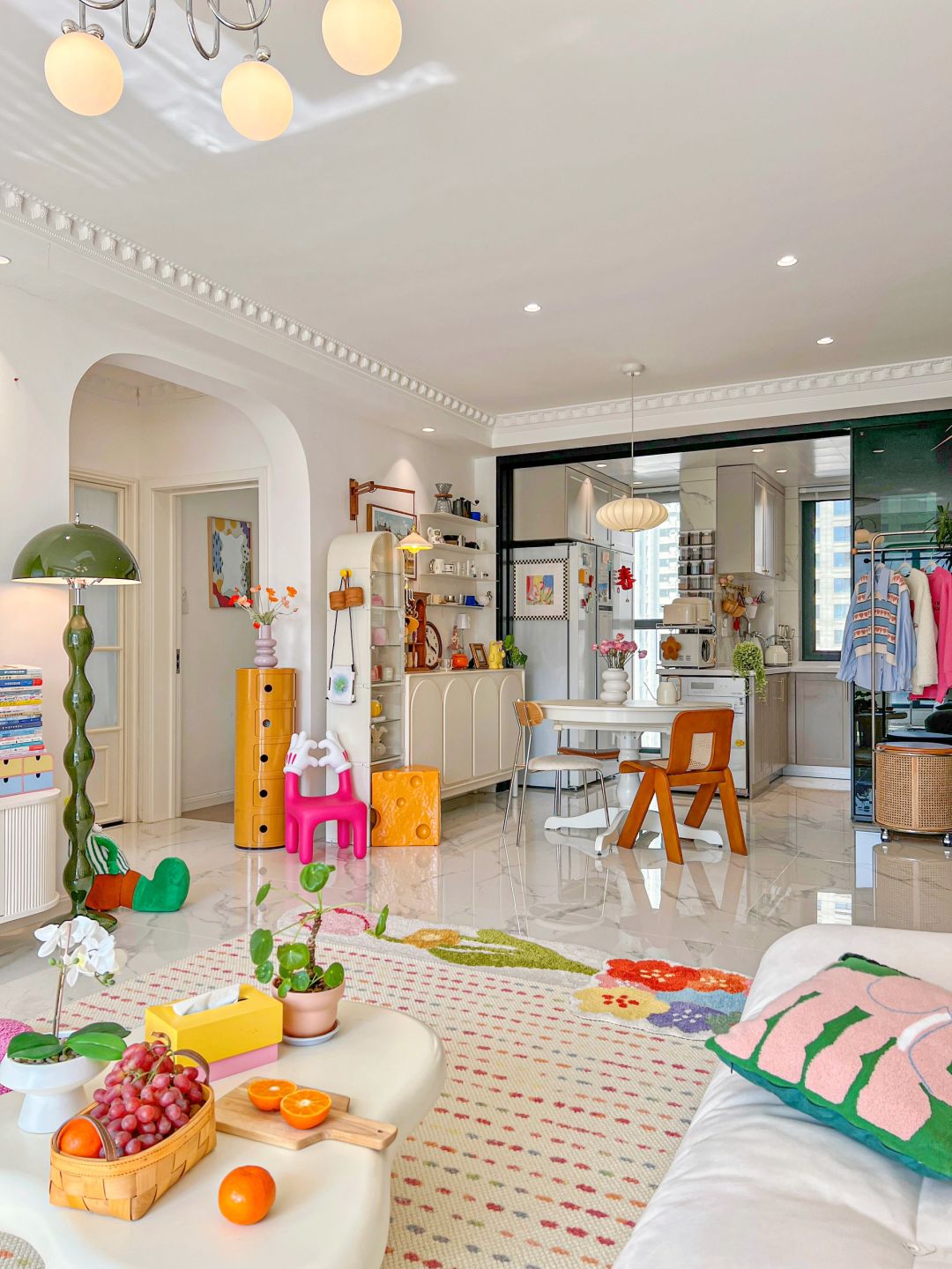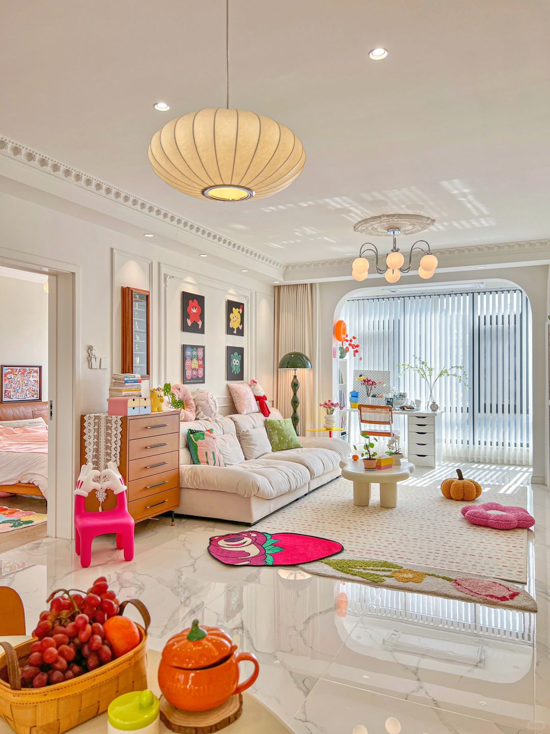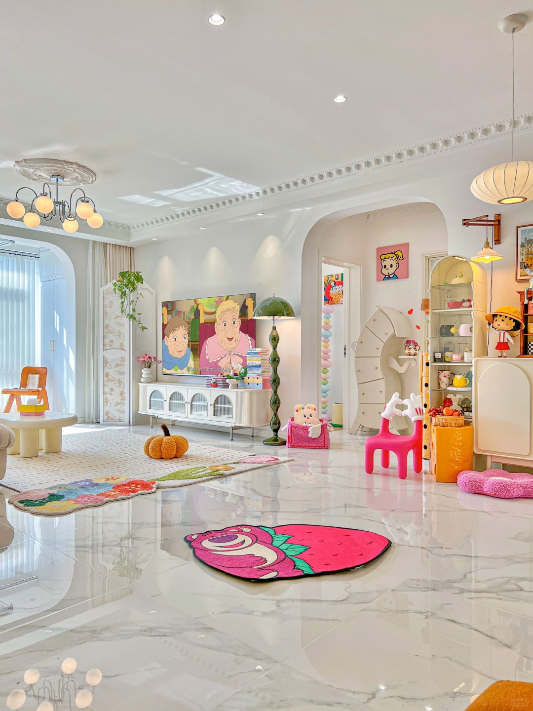蝴蝶结吊灯在客厅中央闪闪发光 钟表在嘀嗒嘀嗒的记录着光阴🕙 把喜欢的草莓熊地毯抱回了家 坐在米奇比心小椅子上就像回到了童年 窝进沙发里享受着温暖又美好的时光! 今天又是好开心的一天呀!🥳