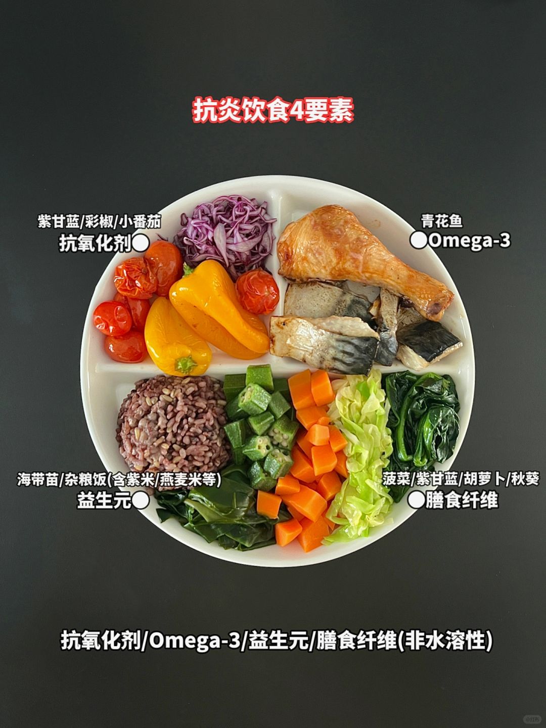 抗炎饮食第93天了 除了感觉肠道通畅了 早晨起来脸不水肿了 身体的无力感 也缓解了很多 每天更有精神了 三餐正常吃 体重下降10.5斤 - 🏷今天午餐食物合集 🐟青花鱼🍗琵琶腿🫑彩椒🍅小番茄/紫甘蓝 🥕胡萝卜/海带苗🍚杂粮饭/秋葵/绿甘蓝/菠菜 🍎苹果🍍菠萝🥝奇异果🫐蓝莓🍇葡萄 - 每日午餐和早餐主要区别就是午餐会吃一些杂粮 比如糙米、紫米、燕麦米等 - 为什么Omega-3是抗炎饮食的核心? 富含Omega-3的食物有哪些?(看图7⃣️) -
