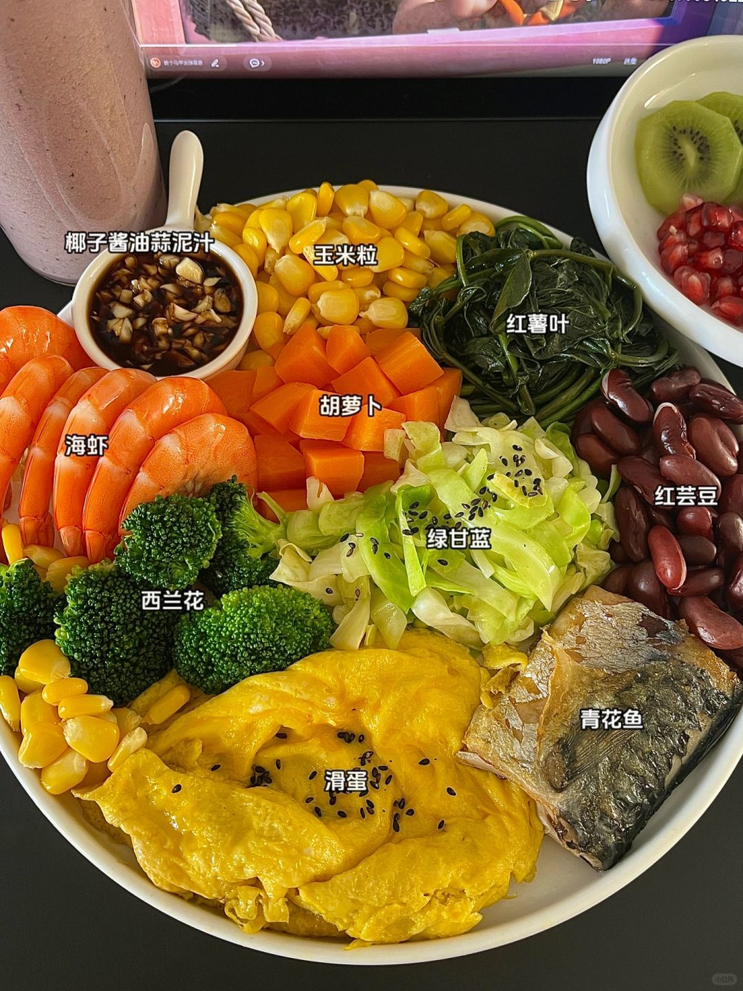 抗炎饮食第91天了 除了感觉肠道通畅了 早晨起来脸不水肿了 身体的无力感 也缓解了很多 每天更有精神了 三餐正常吃 体重下降10.3斤 - 🏷今天早餐食物合集 🐟青花鱼🦐海虾🍳滑蛋🥦西兰花🥕胡萝卜 🌽玉米粒🥝猕猴桃/石榴/红薯叶/绿甘蓝 🫐蓝莓🍇葡萄🍎苹果/紫甘蓝🧄大蒜/红芸豆 - 🏷食材处理⚠️注意 红芸豆质地较硬 要清水泡一晚,第二天沸水煮10分钟 -