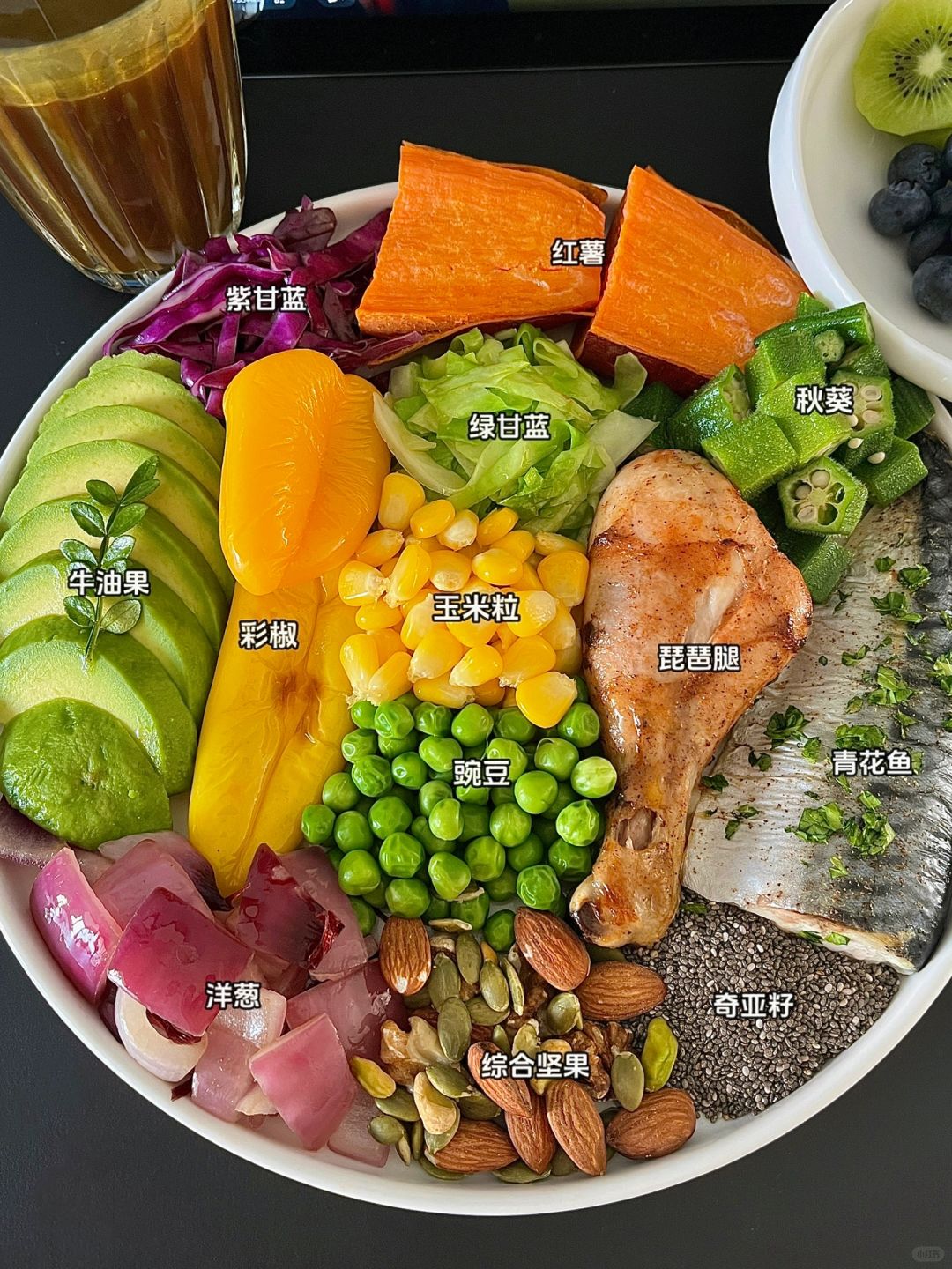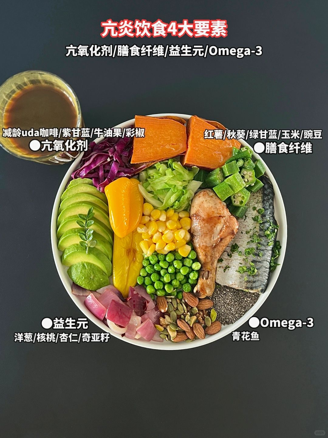 K炎饮食第90天了 除了感觉肠道通畅了 早晨起来脸不水肿了 身体的无力感 也缓解了很多 每天更有精神了 三餐正常吃 体重下降10.2斤 - 🏷今天早餐食物合集 K氧化剂: 减龄uda咖啡/蓝莓/猕猴桃/彩椒/紫甘蓝/牛油果 益生元:洋葱/核桃/杏仁/奇亚籽 Omega-3:青花鱼 膳食纤维(非水溶性): 红薯/玉米/豌豆/秋葵/绿甘蓝 - 今天早餐着重补充了K氧化剂食物 除了一直在吃的浆果类水果/牛油果/彩椒 也新尝试了有K炎K氧化能力的咖啡 -