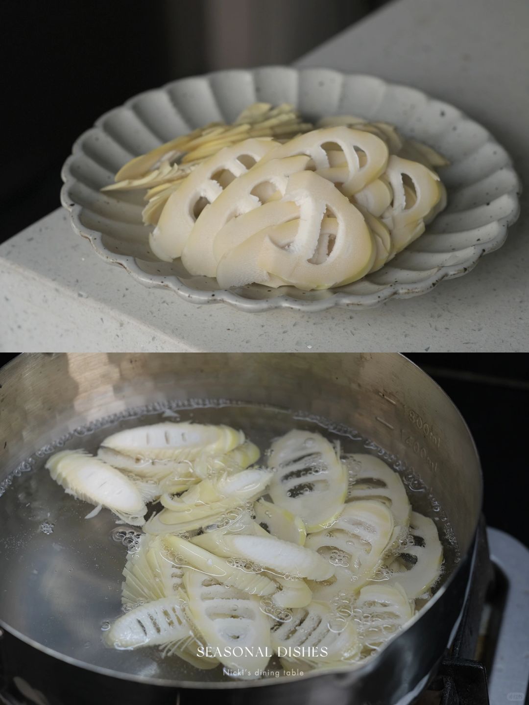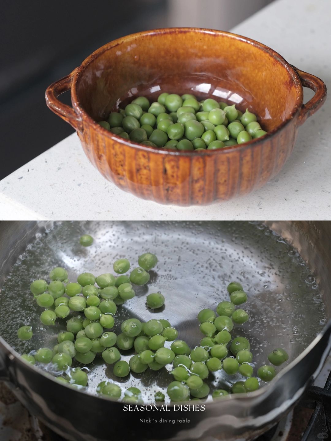 •春笋去壳,去老根,斜切薄片,热水汆烫立马捞出,豌豆同样汆烫捞出。