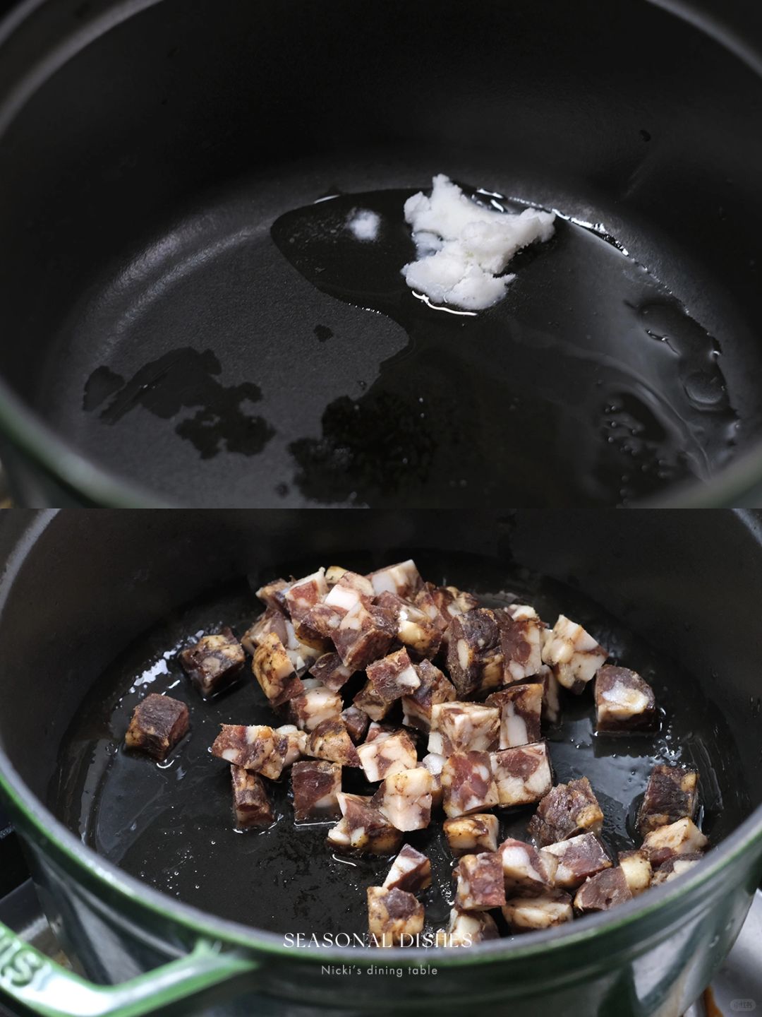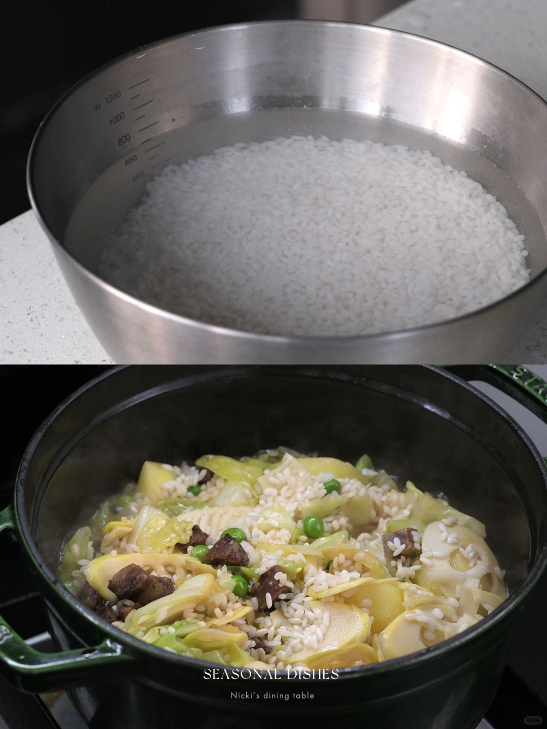 •铸铁锅中放入一勺猪油,煸炒腊肠丁,炒香后倒入卷心菜,炒软后倒入春笋、土豆、豌豆,翻炒几下,最后倒入泡好的糯米和大米,加入2勺生抽,适量盐,翻炒均匀后,加水(蔬菜容易出水,所以水要比平时煮米饭少一些)。