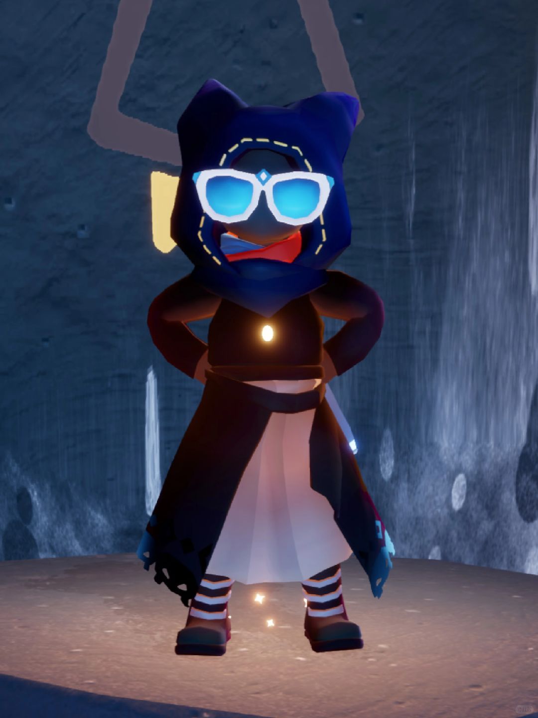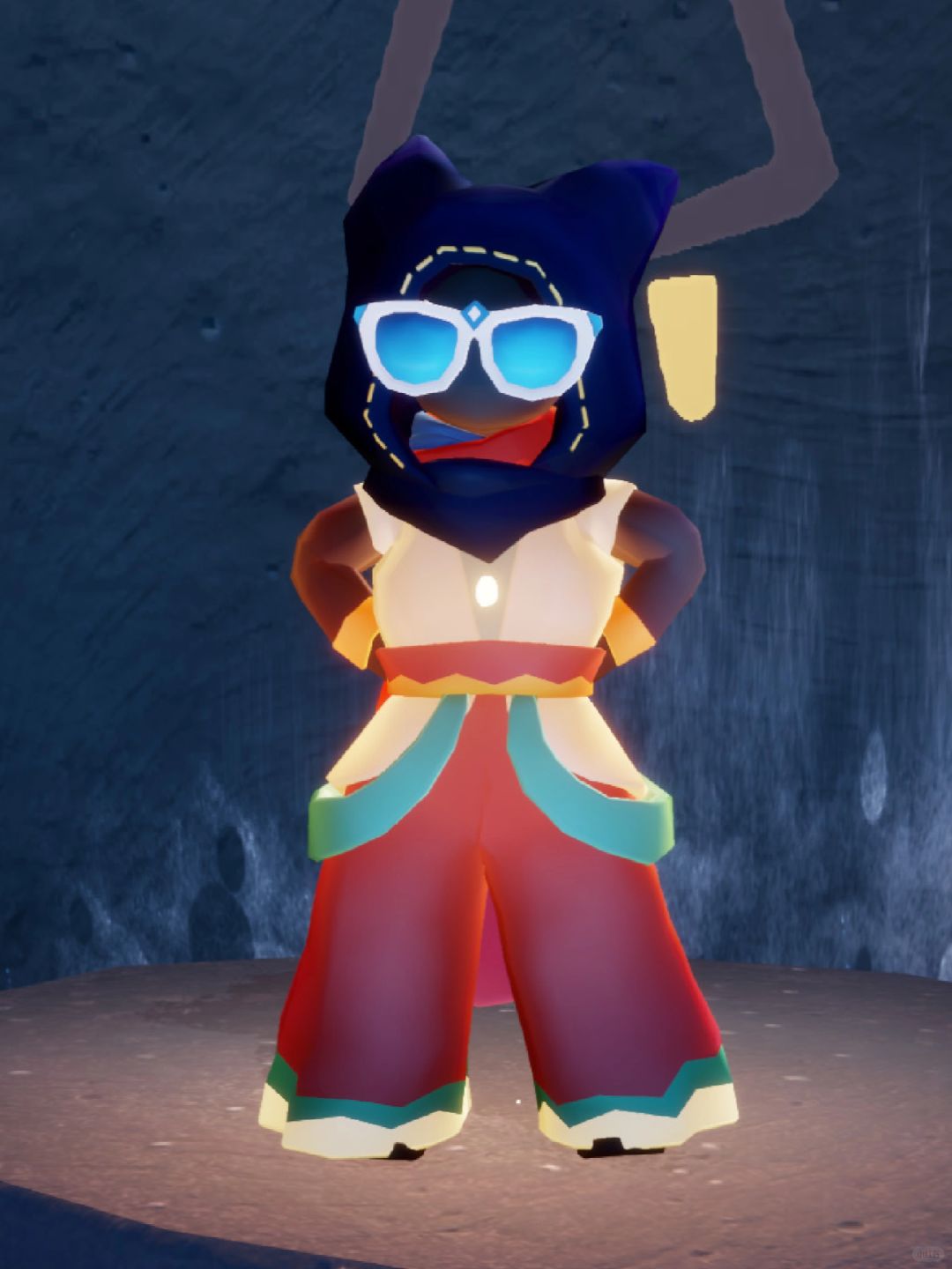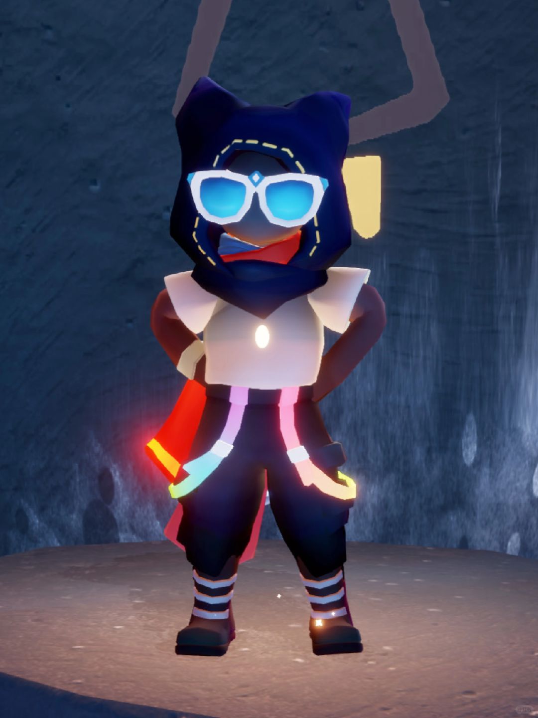 🫐3.这个裤子是彩虹日的裤子,配万圣节靴子,颜色上可能和猫猫头会不搭,所以我加了海洋节的蓝色墨镜,提亮脑袋的颜色。
