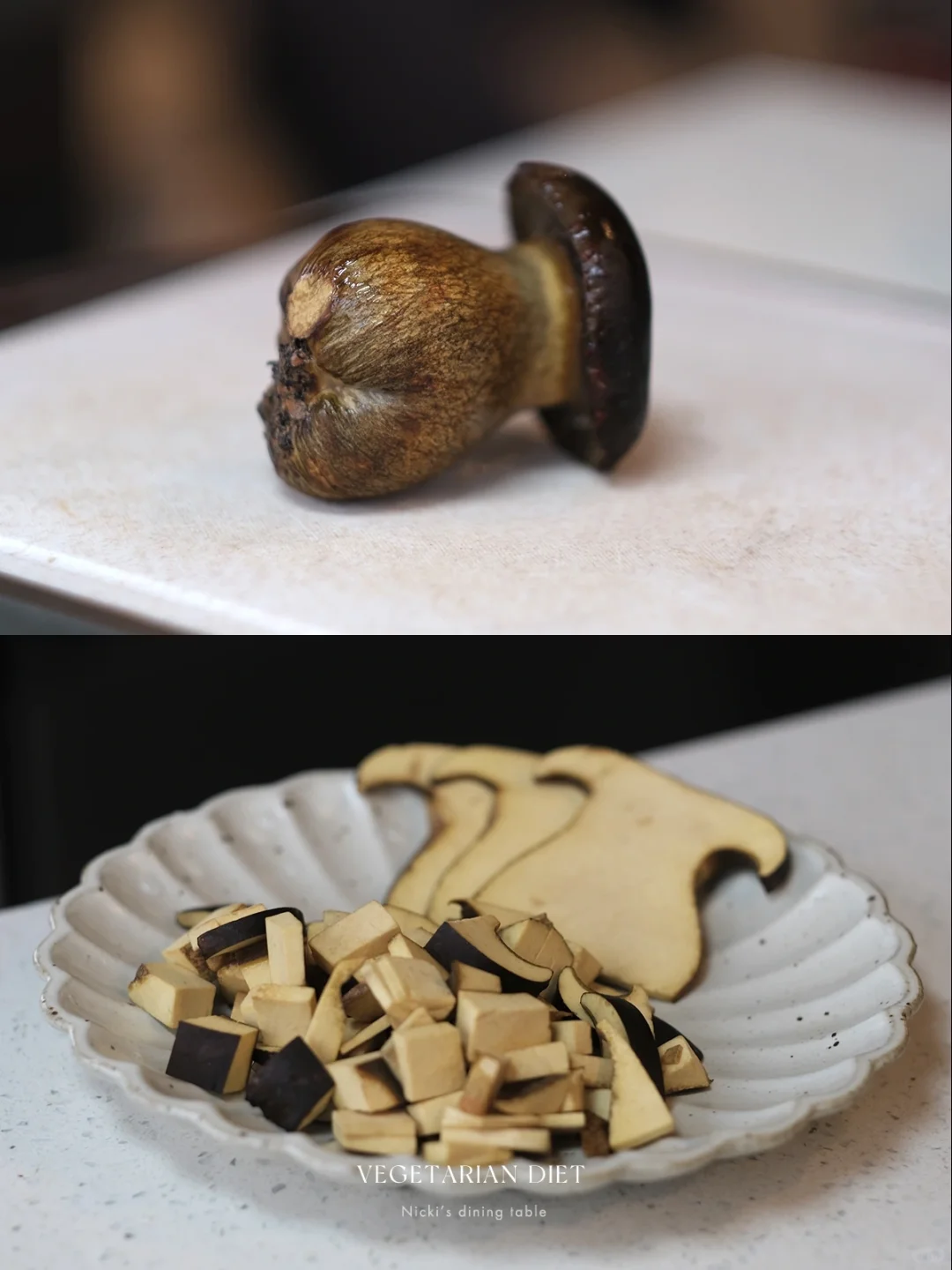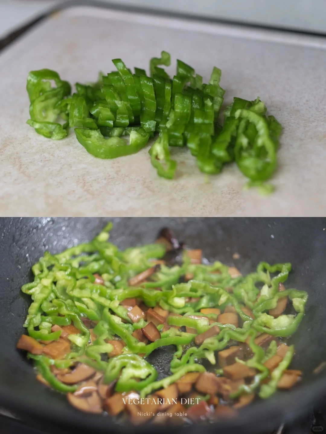 •牛肝菌中间段切片,边角料切丁,青椒洗净去籽,切丝。