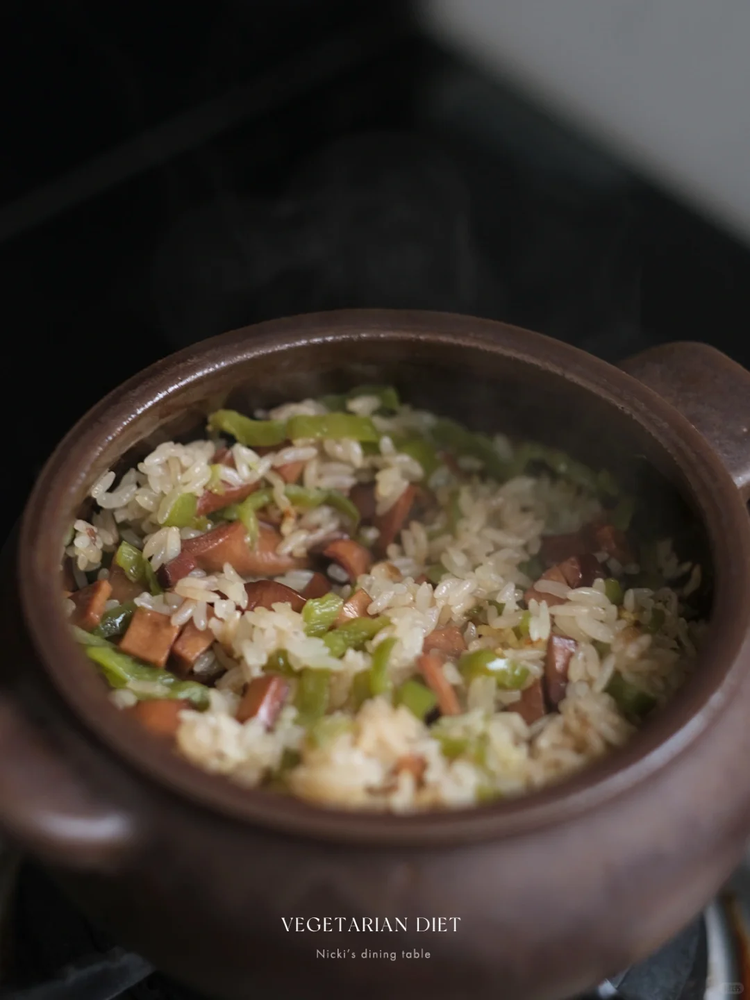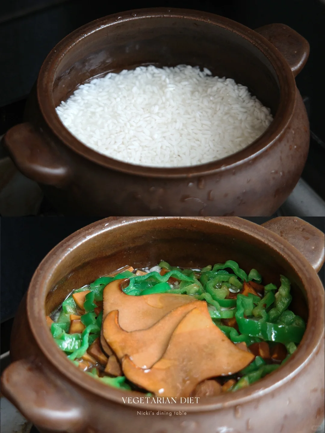 •土锅中用刷子薄薄地刷一层油,倒入泡好的米饭,加入纯净水,水微微盖过米,铺上炒好的青椒牛肝菌和牛肝菌片,盖上盖子,中火煮到土锅气孔冒烟转小火,煮10分钟左右,关火再焖5分钟即可。