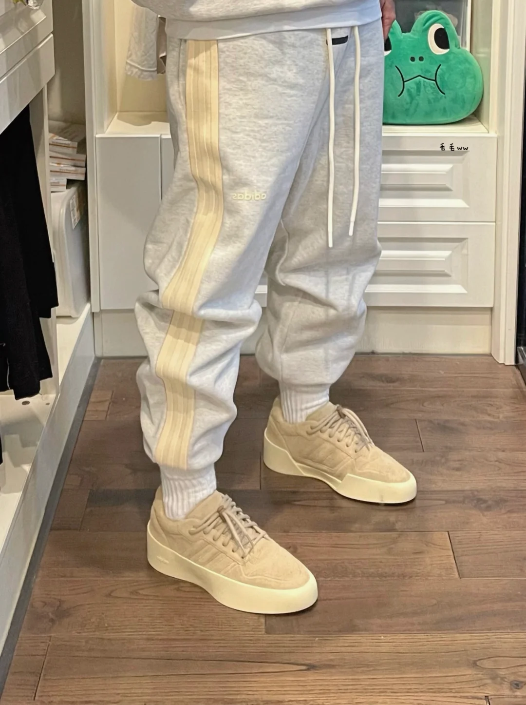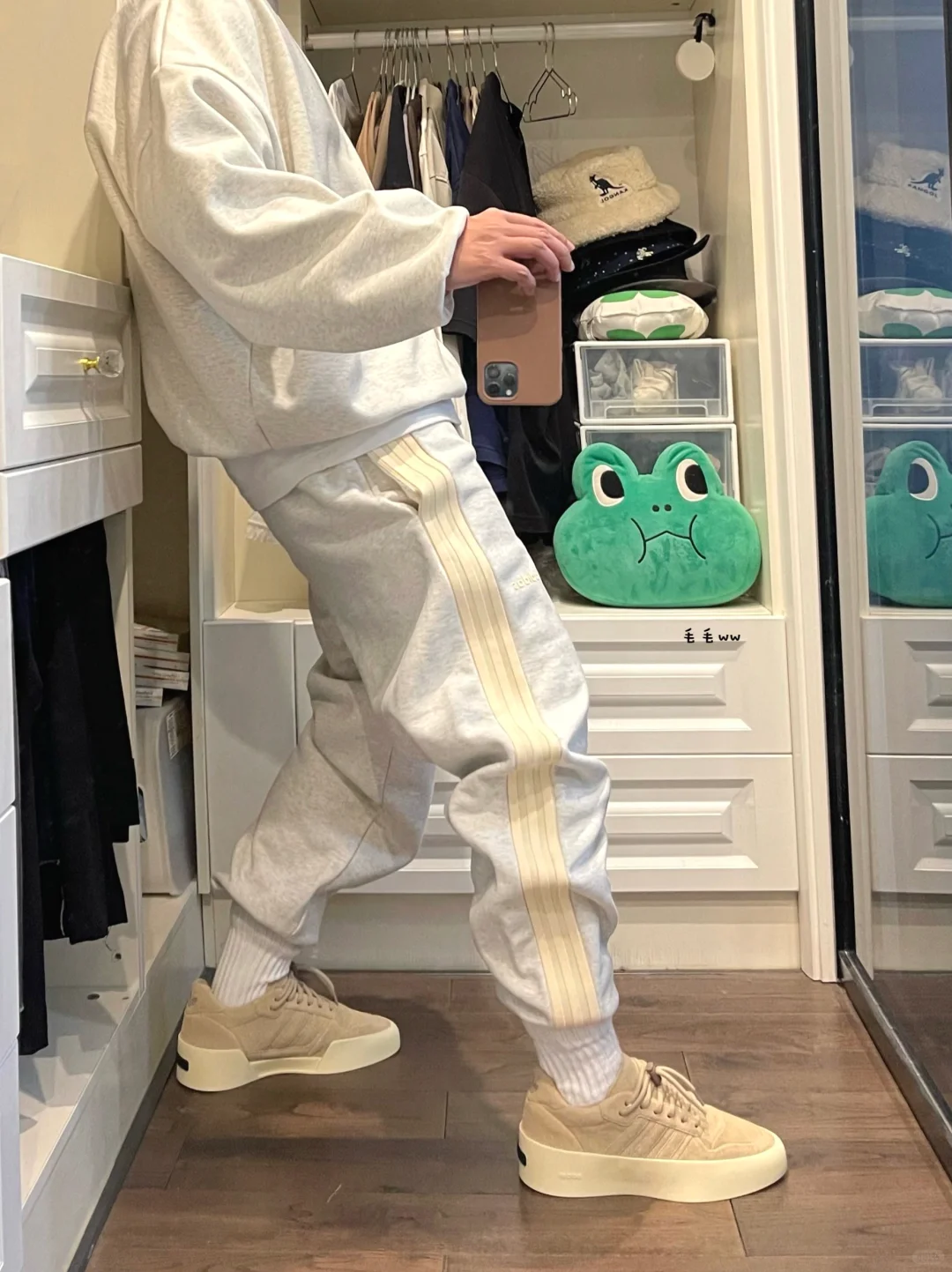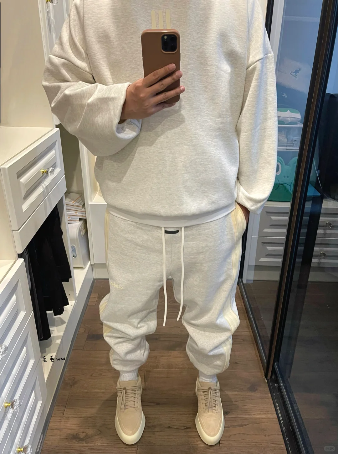 -Athletics 24SS如约而至,最值得关注的还是裤装,除了开季的束口裤,还有平口拉链裤 . -与开季主推的黑色相反,本季主打浅色;雪花灰或者叫古白色,区别于纯白,细节点缀奶油黄 . -虽说是春夏季,仍然内里加绒;套头圆领比帽衫好穿,领口太紧问题没有改动,袖口裤口同样设计 . —————— . ✏️本人178cm75kg 球鞋尺码265mm(正常EU42) . 💭以上均为我个人观点,不喜勿喷,欢迎讨论。