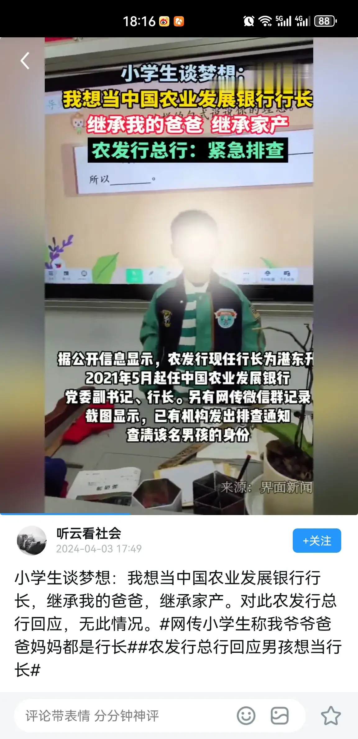 农业发展银行某支行行长的儿子声称要继承农发行,引发网友热议。