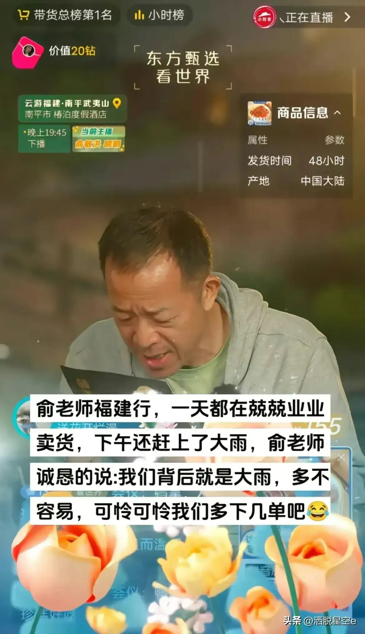 福建行与明明直播,老俞只能硬着头皮自己来当主播,明明连话都接不上,老俞想吟诗作对,也是被明明冷场应对,不是不愿意接,而是根本接不住,只能说“土豆丝雨”、“承重墙雨”这种不着边际的话,要多尴尬就有多尴尬!老俞也是一脸沉重,最后只能苦苦哀求粉丝下单,我的天呐!直播到了这种地步意义何在?