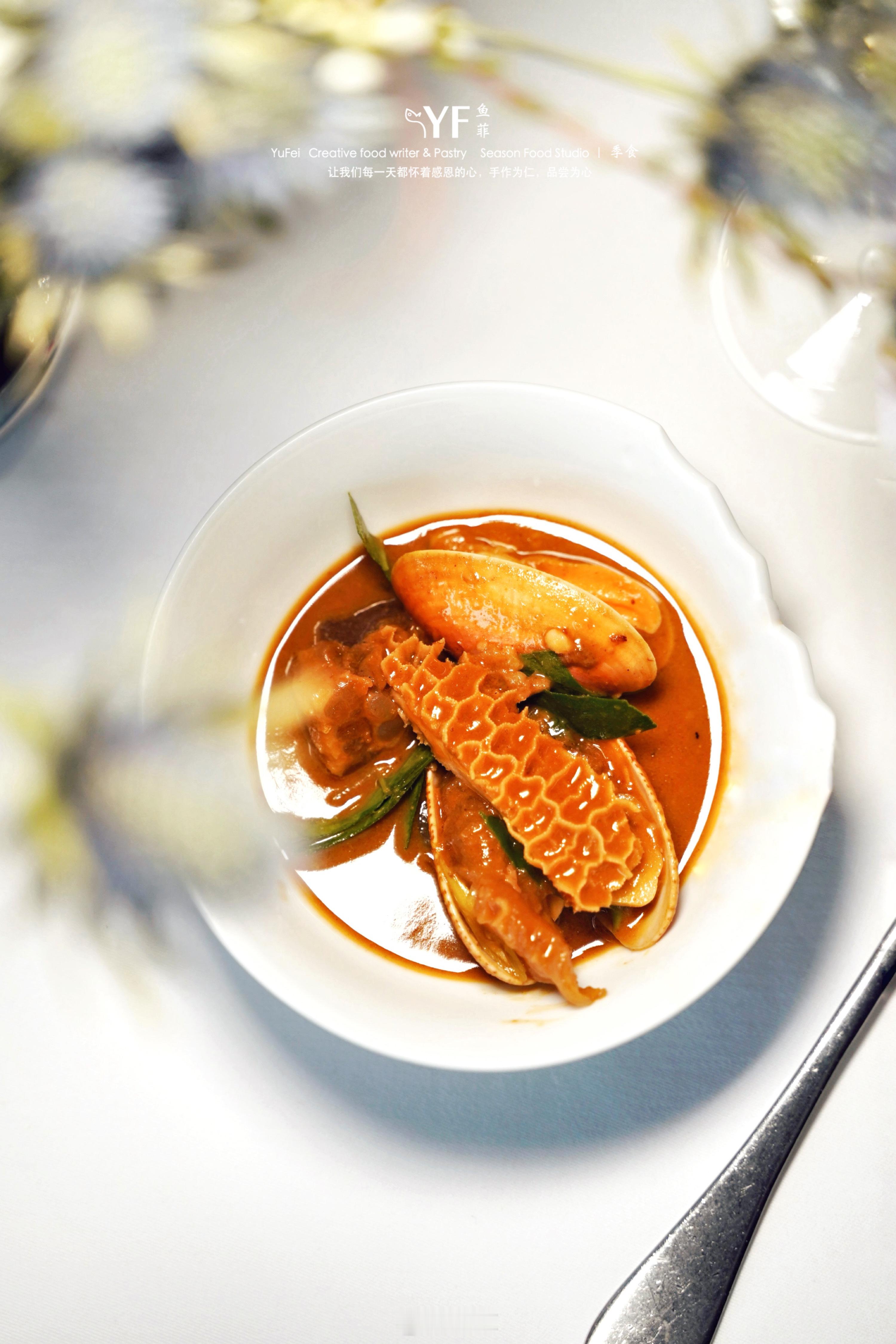 网油羊肚菌裹牛肉,佐以鲍汁,金雀花之点缀,西餐与中餐之完美融合。欠我们一碗粉面饭煲的芒果螺炖咖哩金钱肚牛筋,汤汁之中白葡萄酒与Tahini芝麻酱,香气浓到化不开。🍖