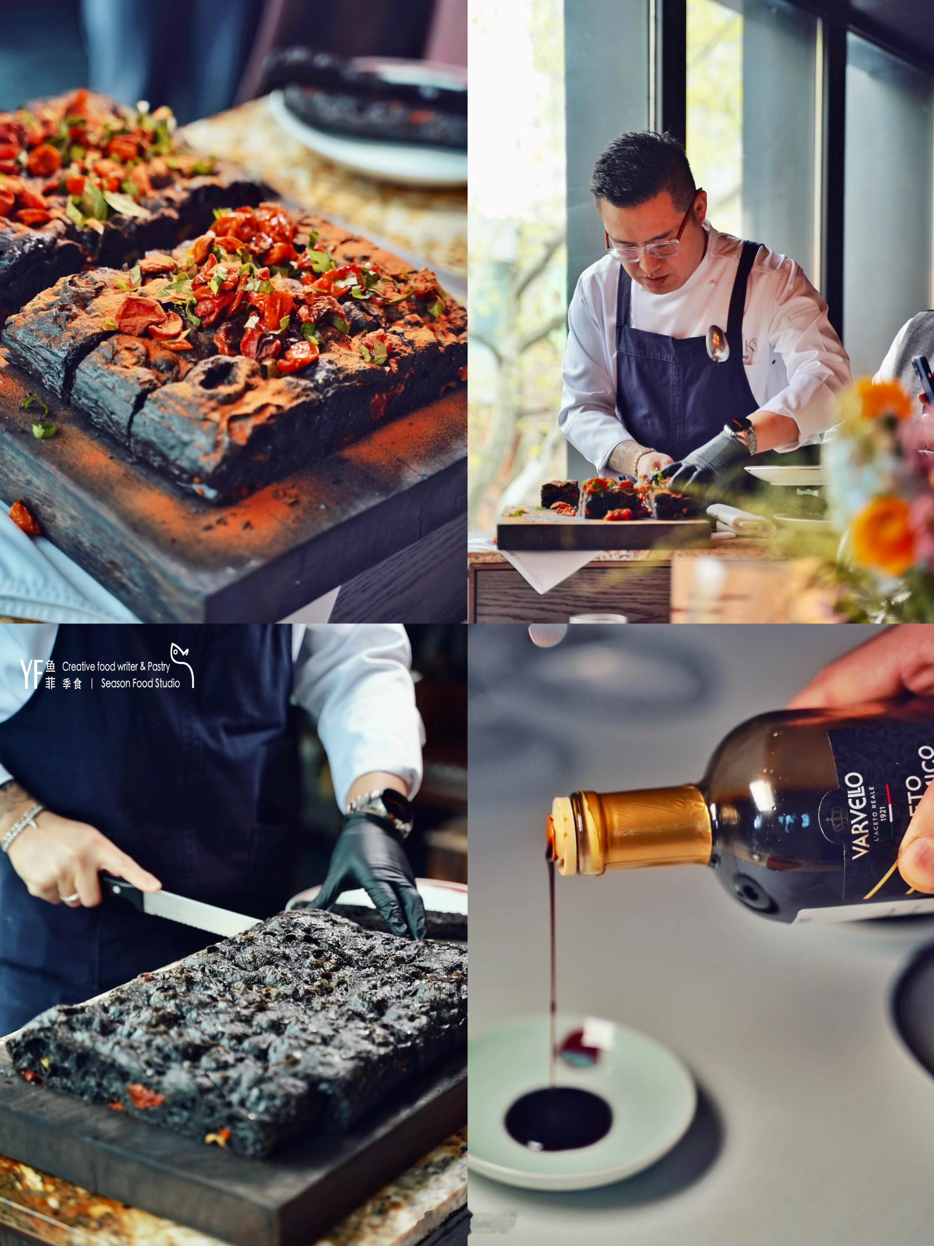 开场半平米见方的“墨鱼汁贵州酸浆西红柿佛卡夏面包”,经过一抹番茄迷雾氤氲而落的西红柿霜粉夹持,松软透着酸甜。酵母也不马虎,用葡萄籽、葡萄柚发酵而成,蘸上意大利黑醋橄榄油,那种强烈多层次的酸度以及丰盈感,让人难以把持!