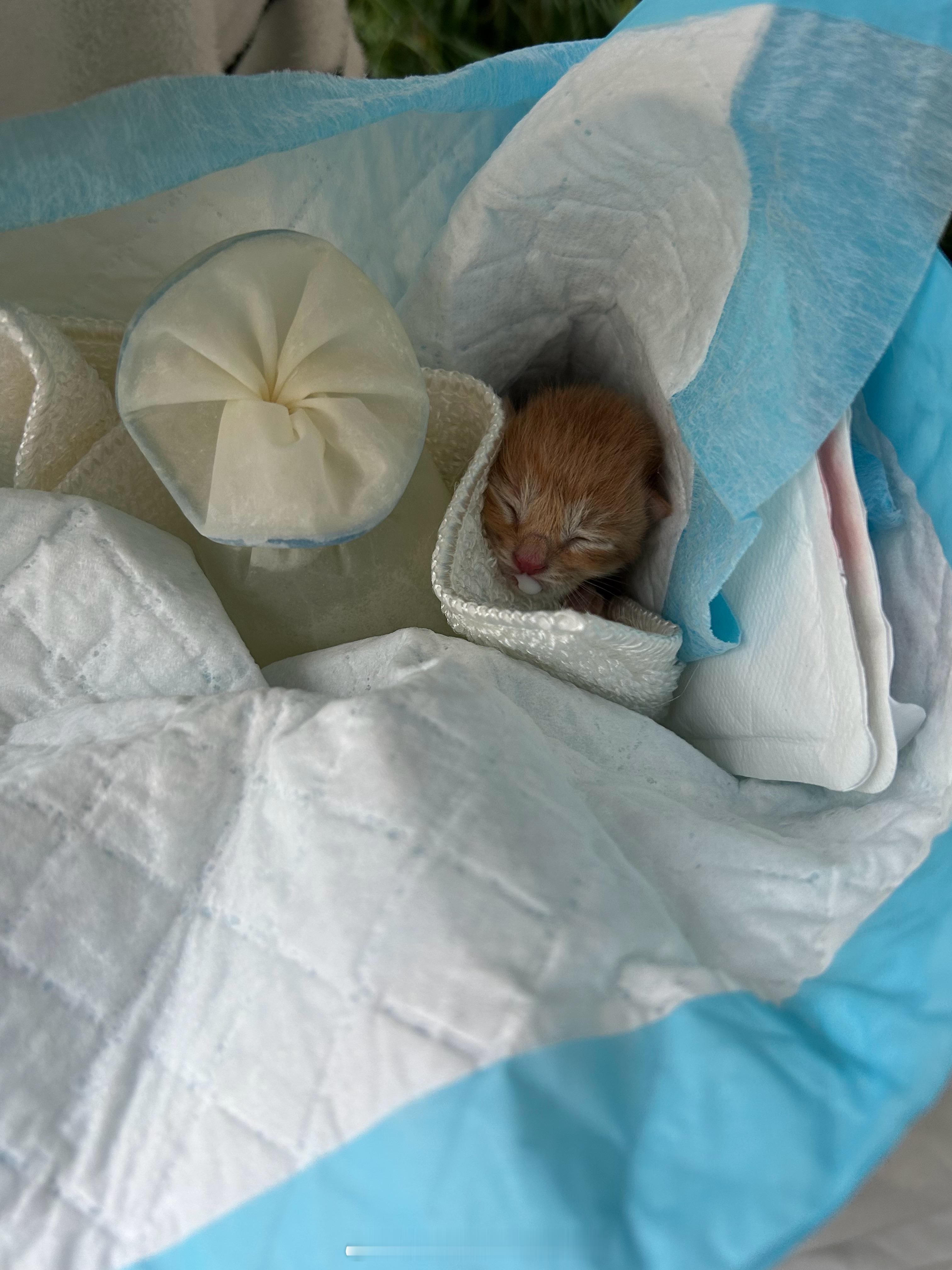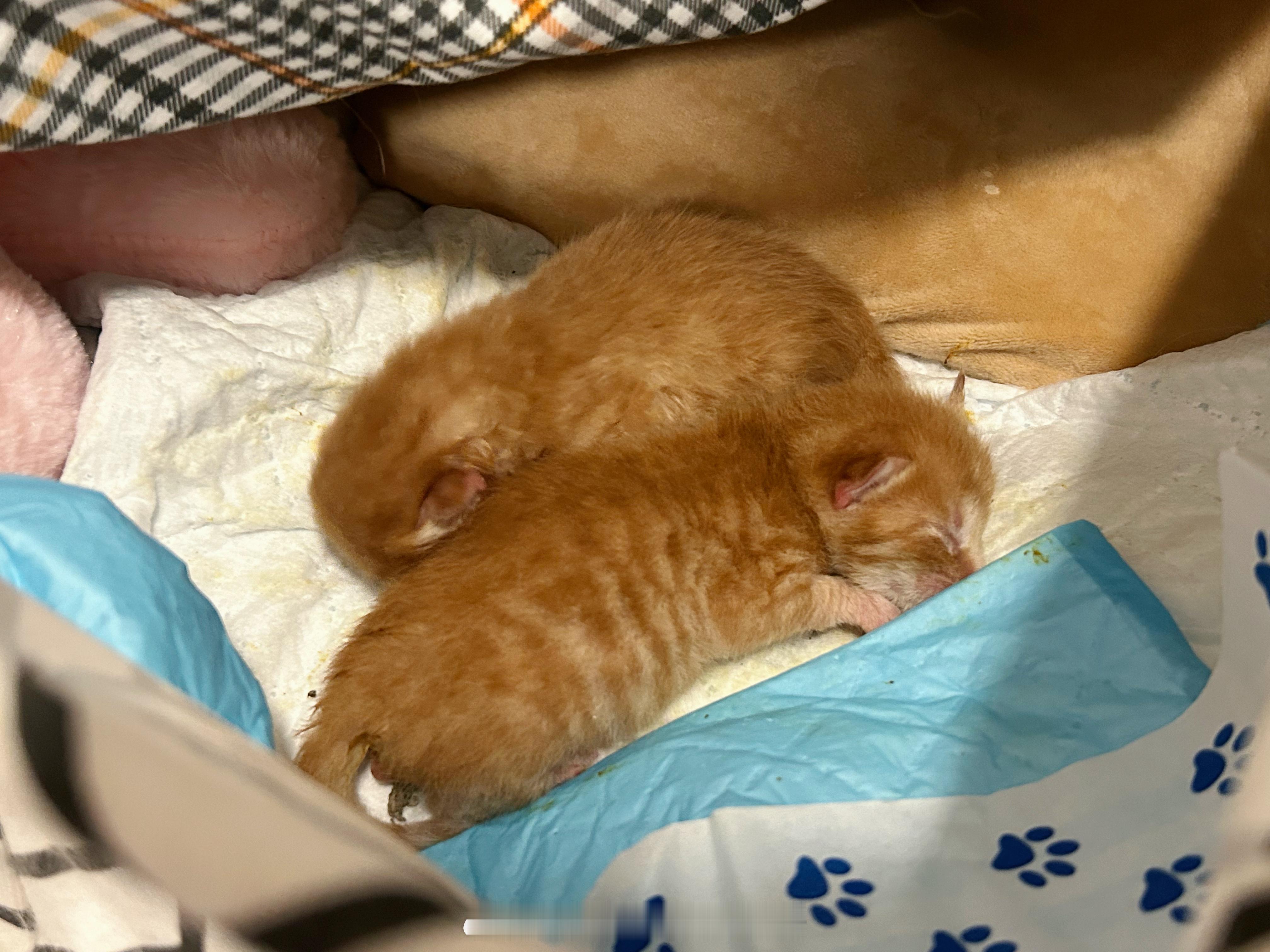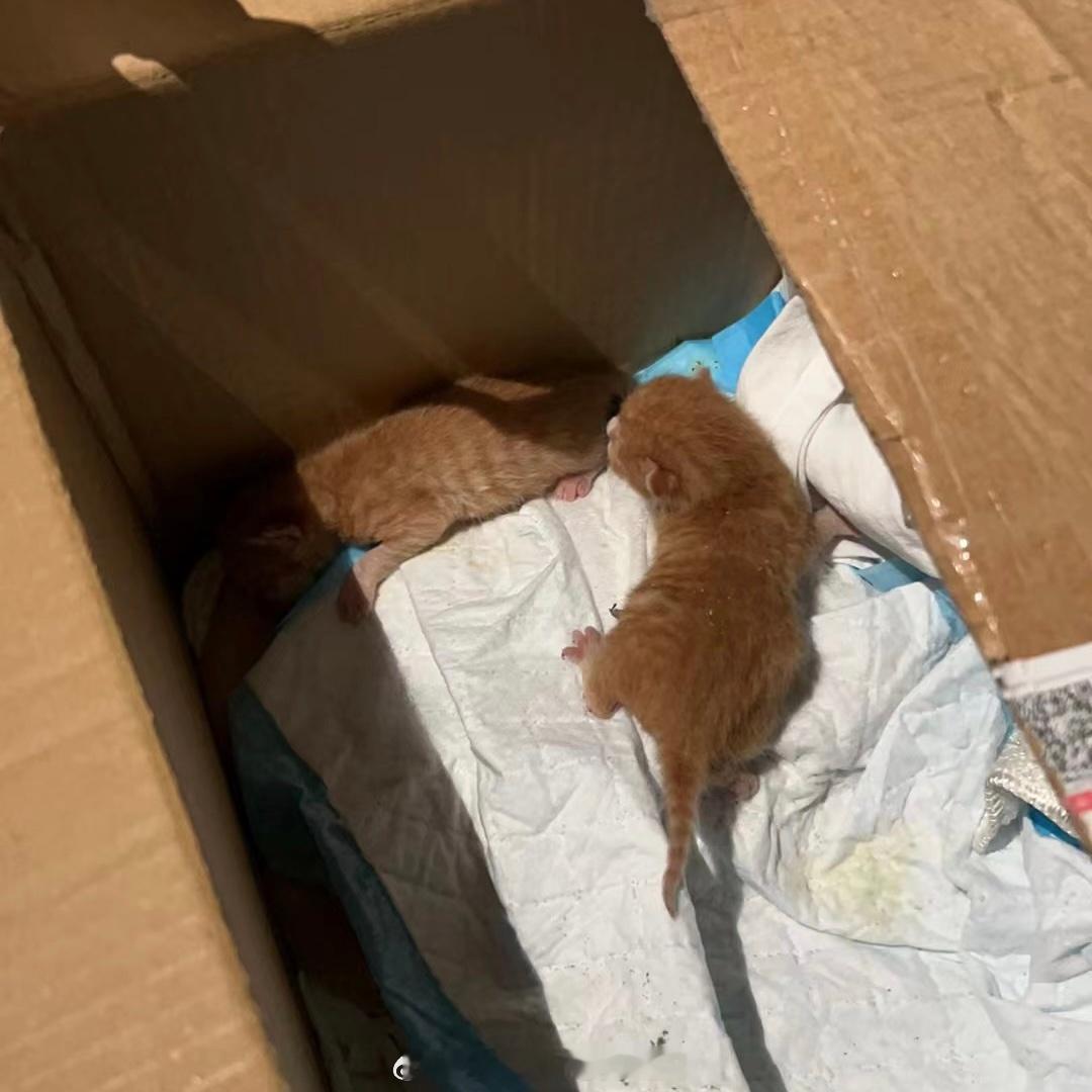 下午发现了一只刚生的小猫 给猫妈妈放了奶回去了 结果小猫掉进去了 出生第一天(估计是吧)就泡了奶浴 还好有邻居在 没淹死 救起来去医院了 是弟弟 因为妈妈不管 一起每两个小时去手喂 结果夜里11点去又发现了第二只[融化] 猫妈不知所踪 夜里冷 还下雨了 带回家了[融化] 可小 像两颗花生🥜