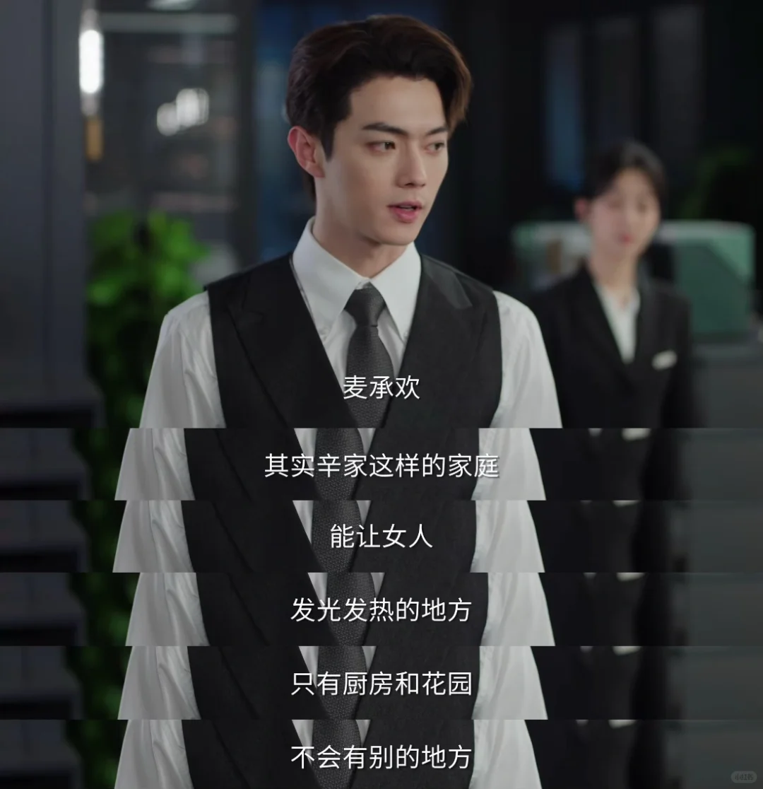 如果说姚志明的头脑中95%都是理智,但对这个例外麦承欢而言,理智与情感是调和的。麦承欢外柔内刚,虽然她与妈妈相处的时候会内耗(这说明她的调和以妥协为基础,还没达成调和的最佳状态),但她本人的性格已经足以激发出姚志明心里真实的情感,所以姚志明一边试探她一边对她说真话。他说“没有人会看你的硬骨气,只会看你的硬实力”,这是告诉承欢嫁入资产过亿的辛家若想幸福要以实力为托底;跟麦承欢说“辛家这样的家庭能让女人发光发热的地方只有厨房和花园”,这是在提醒她辛家虽家底丰厚,但对她本人的自我实现助力有限,他话说得直白,但都是情感的自然流露,虽然这种情感他自己都没意识到。