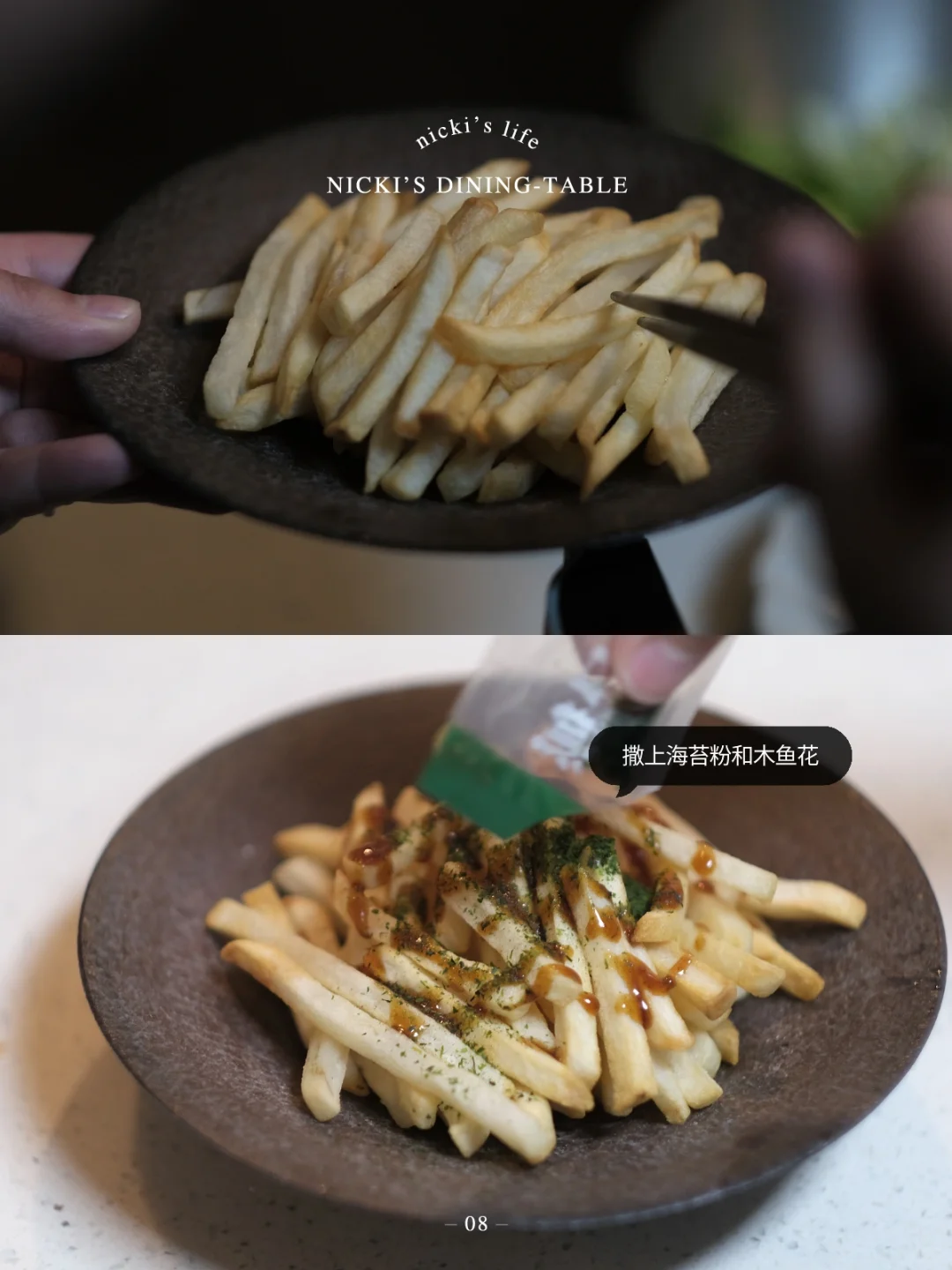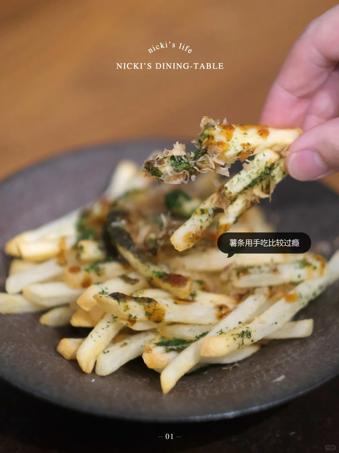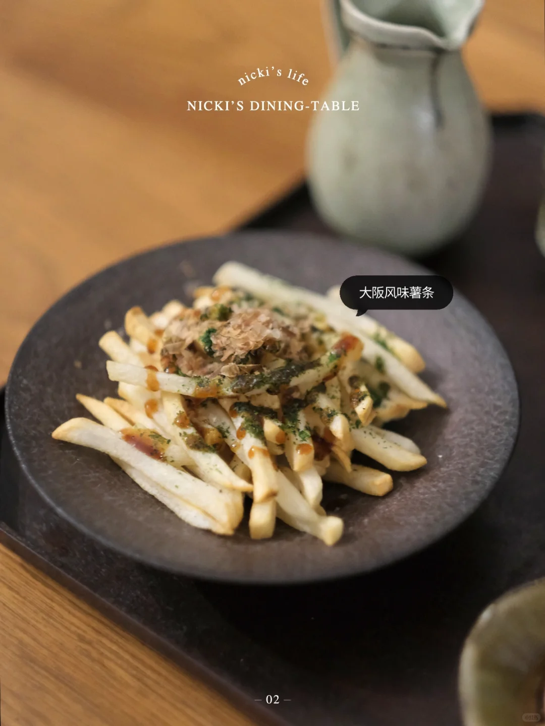 这一道是在日本的一家烧鸟店吃到的,其实操作很简单,只是把原本的章鱼小丸子替换成了薯条,薯条酥脆的口感我觉得比章鱼小丸子好吃的多,也不怕吃几个就饱的问题。