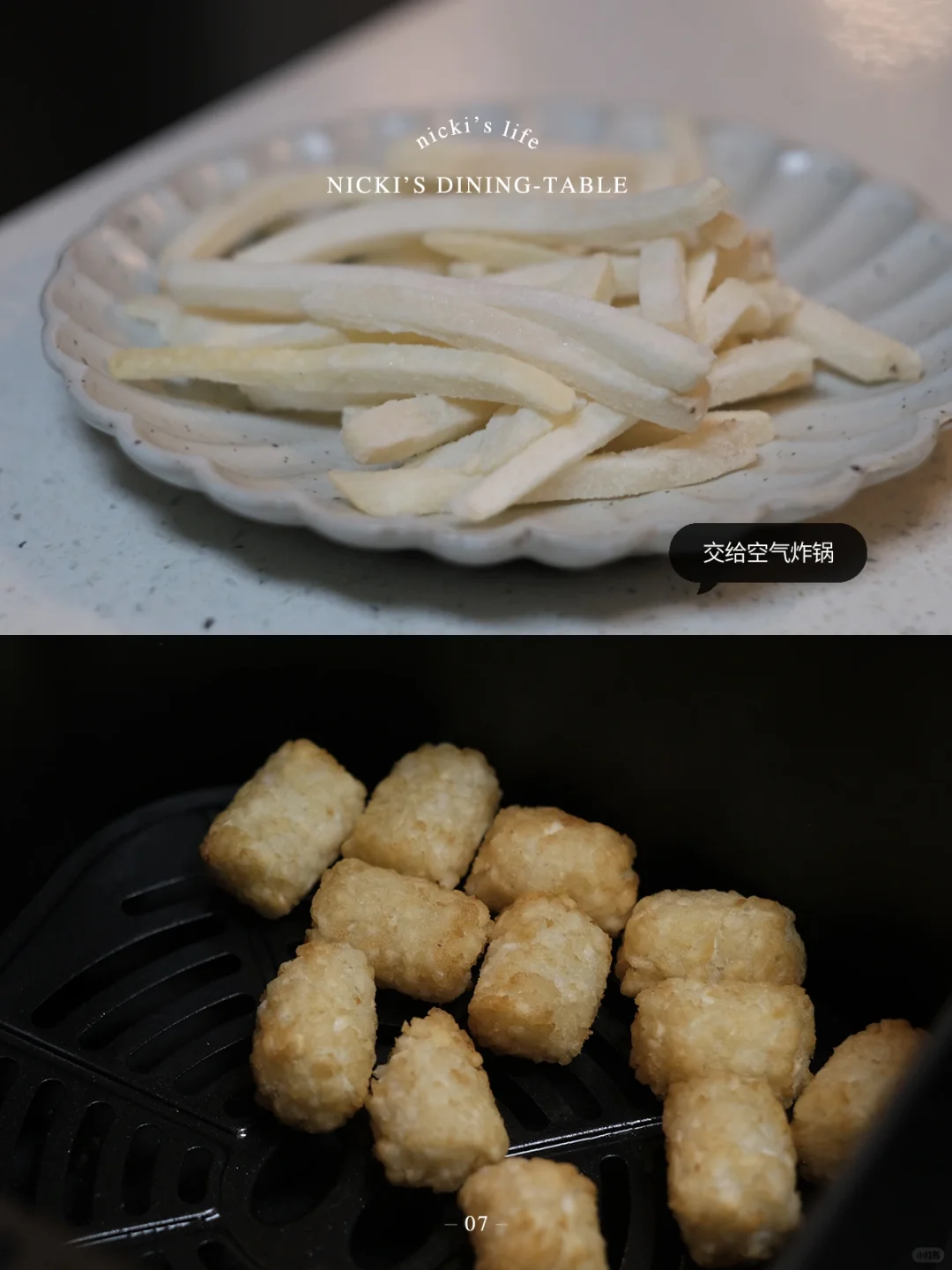 这一道常见的其实是土豆条或薯角,关键是要把土豆炸的外脆内绵才好吃,我直接用美国迷你薯饼代替,它是用美国新鲜的高品质马铃薯制作的,放空气炸锅200度15分钟,可以节省很多时间,也不用担心土豆没有炸到位。
