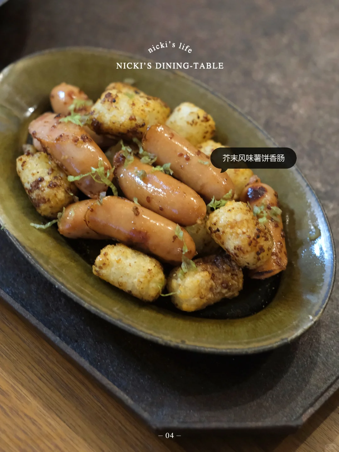 ·香肠切4cm左右的长度,锅中少许油,放入香肠煎片刻,放入炸好的薯饼,加入1勺芥末籽、1勺蜂蜜炒匀即可出锅。