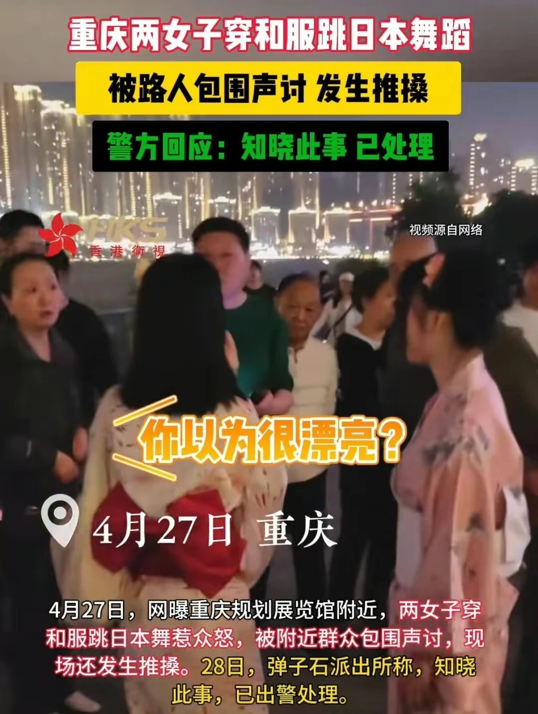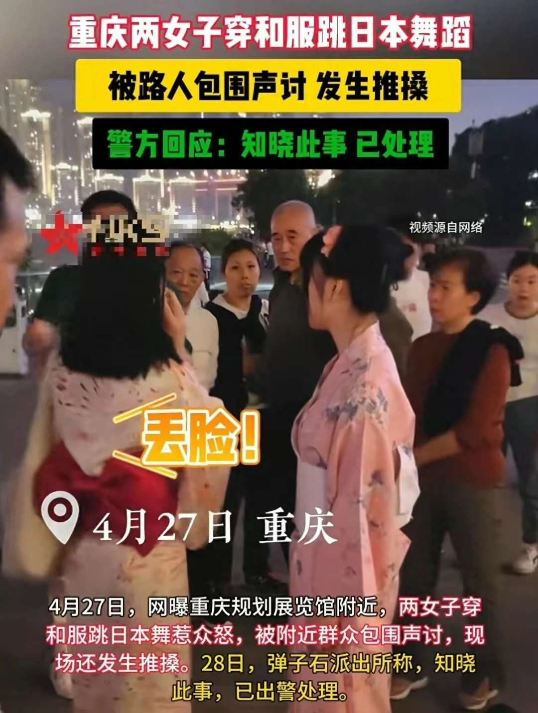 重庆纪念碑穿和服后续进展来的!和服女孩的父亲视频中表明态度:让广大网友向他女儿道歉,如果不道歉的话,他将带他女儿远走高飞,离开这个国家,去往国外,再也不回来! 4月27日晚上,重庆市南滨路,两名年轻女子穿着和服跳舞,同时还有一名年轻男子头上绑着白布条,在录视频。他们的行为受到了多位重庆市民的阻止和劝告。在抗日战争中,我们3500万革命先烈们以自身宝贵的生命和鲜血为代价,捍卫了国家的尊严和民族的独立。然而,没过多久,他们的后辈子孙忘却了那段耻辱的历史!有这样的父亲才能教育出这样的孩子,不要小看父母对孩子的影响,言传身教。真的是上梁不正下梁歪,原来她爸才是罪魁祸首,真是害了他女儿,从小接受的教育就这样,眼界和心智也就这样了!